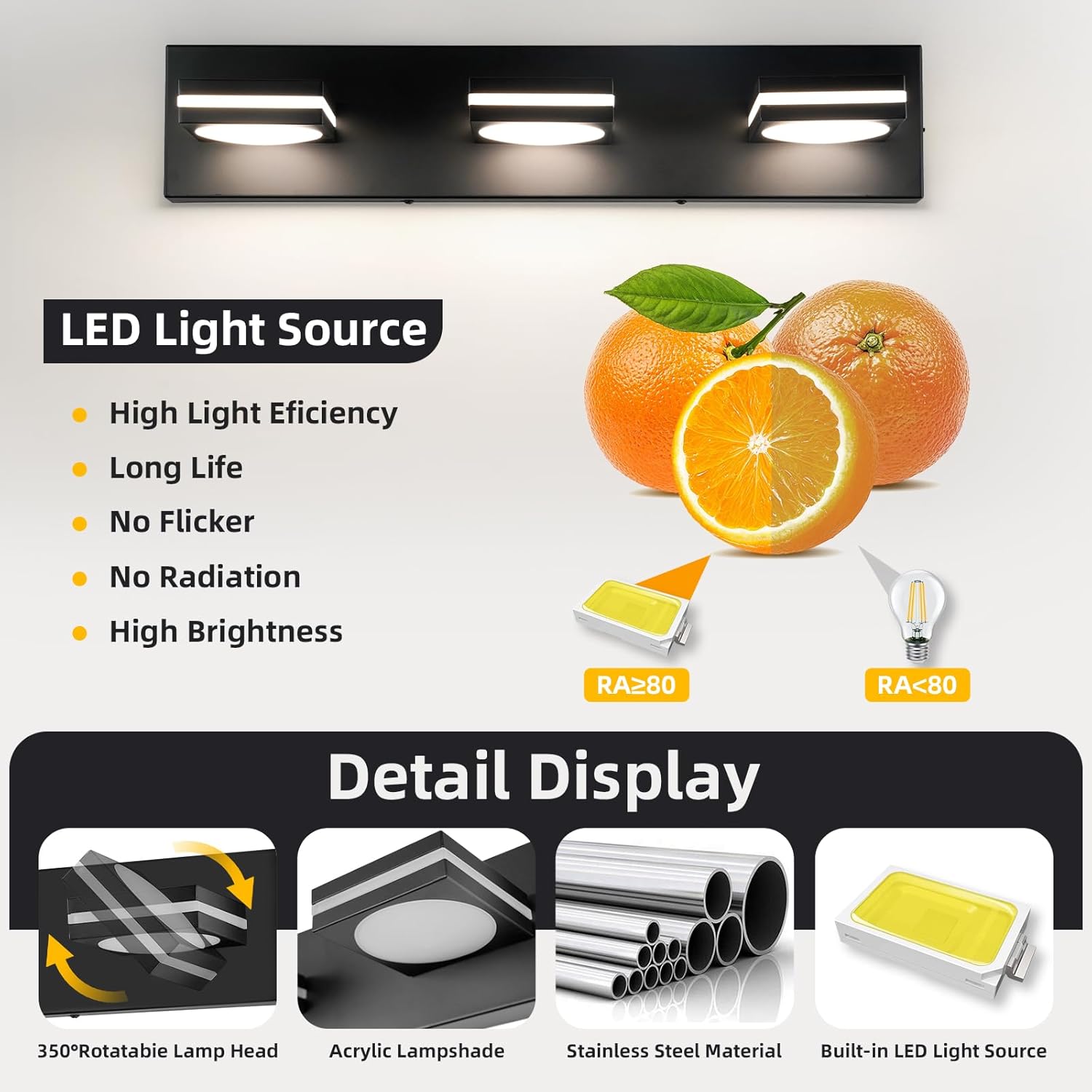 Versatile Lighting & Size: The 350° rotatable lamp head allows for customized lighting direction, ensuring optimal illumination for all your bathroom needs. 21.65″ x 5.12″ x 4.33″.
