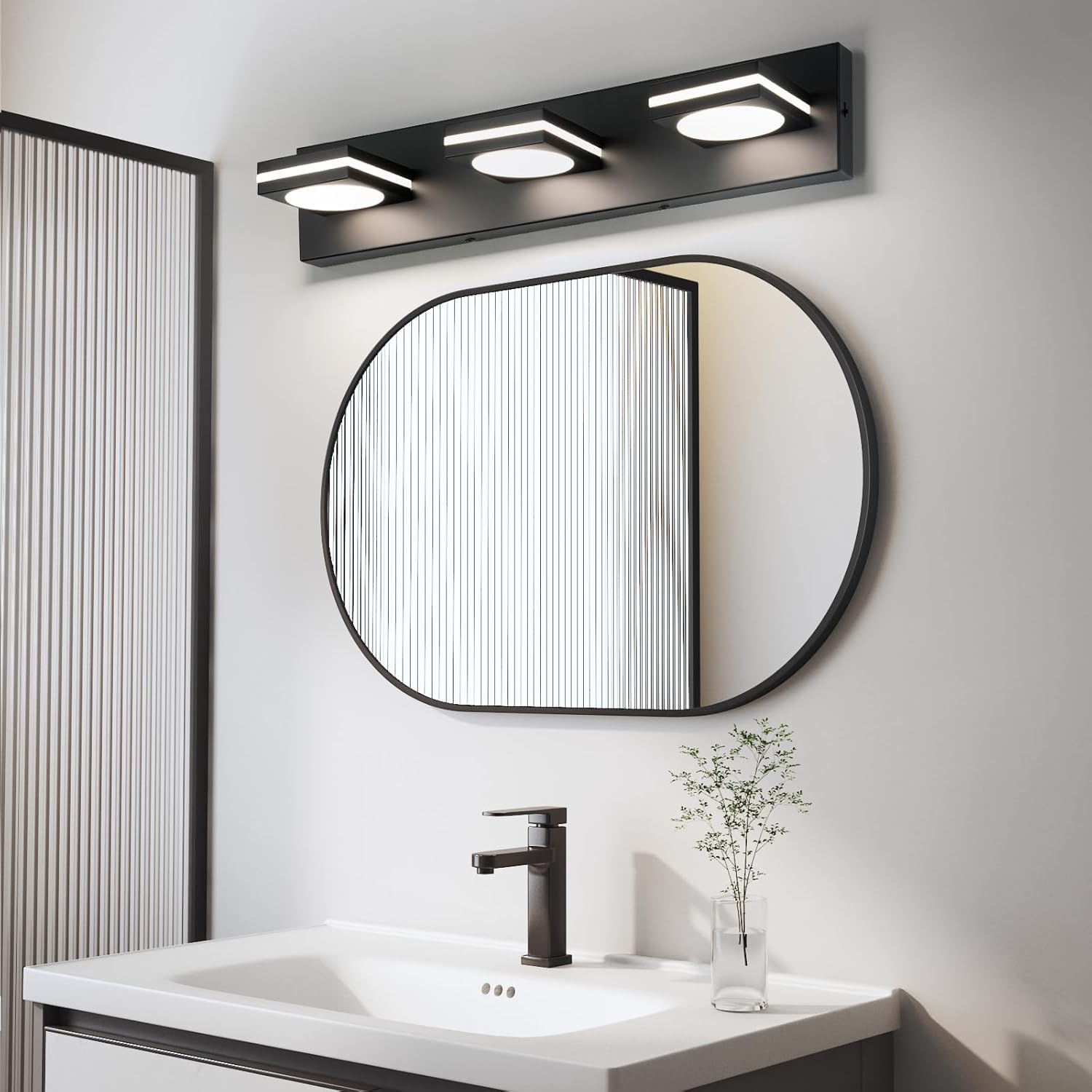 3 – Light & Modern Design: This bathroom vanity light boasts a sophisticated, modern design with a matte black finish that complements any contemporary bathroom. Its clean lines and integrated mounting above the mirror create a polished look.