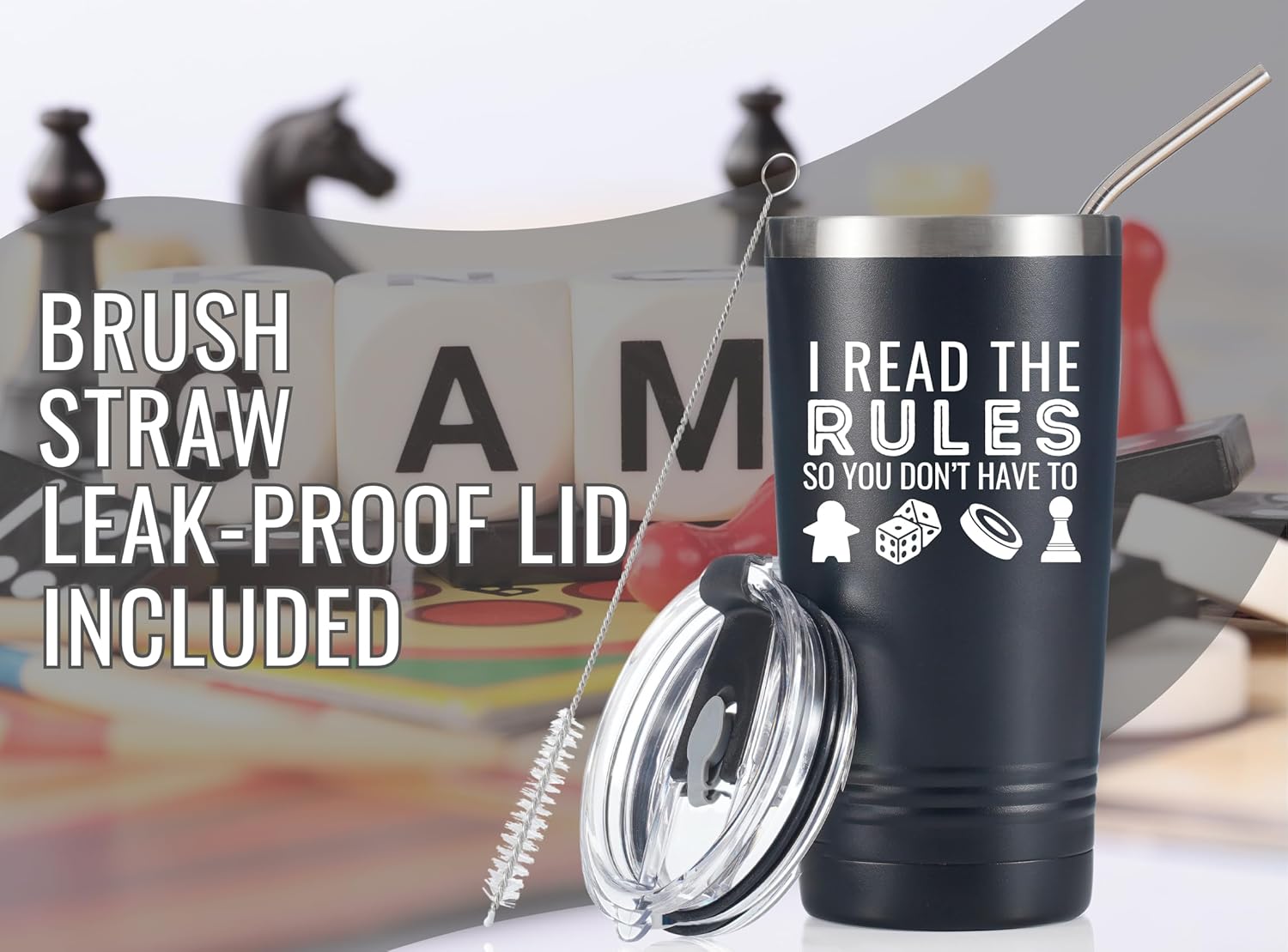 Onebttl Board Game Lovers Gifts, Gifts for Board Gamers, 20oz Stainless Steel Black Insulated Tumbler with Lid & Straw, Black – I Read the Rules, So You Don’t Have to