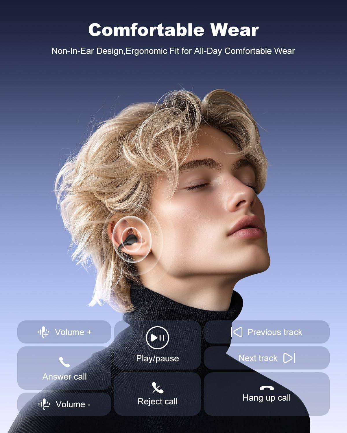 👑𝗟𝗜𝗚𝗛𝗧𝗪𝗘𝗜𝗚𝗛𝗧 𝗙𝗜𝗧 & 𝗪𝗔𝗧𝗘𝗥𝗣𝗥𝗢𝗢𝗙 — Our clip on headphones are designed for ultimate comfort, 4.5g Lightweight design allowing you to use for long time without discomfort. No matter how long you use it, whether you encounter a sudden downpour or sweating at the gym, the bluetooth earbuds always maintains optimal performance, ideal for users who seek a comfortable and convenient experience.