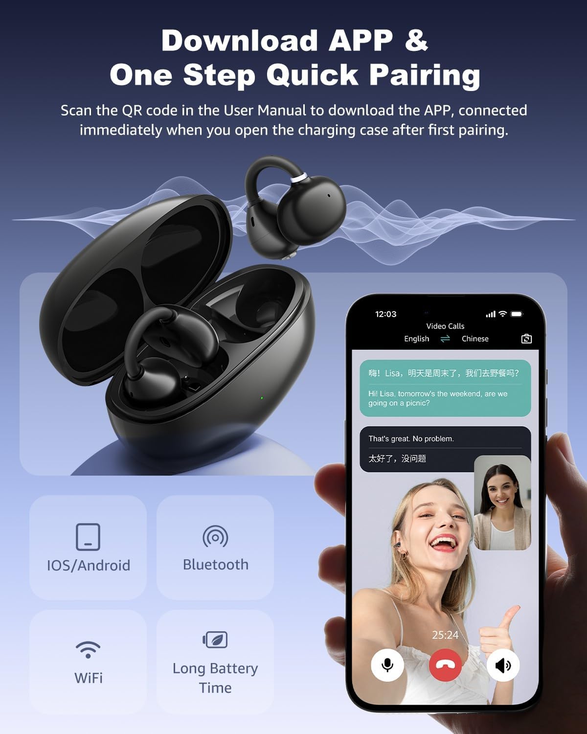 Customers find these earbuds comfortable with an open-ear design that’s suitable for extended wear, and appreciate their crystal clear sound quality. The translation feature receives positive feedback for its real-time capabilities, particularly in translating between English and Spanish, while the Bluetooth connectivity is quick and stable. Customers praise the long battery life, with one noting a 500mAh capacity, and find the earbuds worth their price.