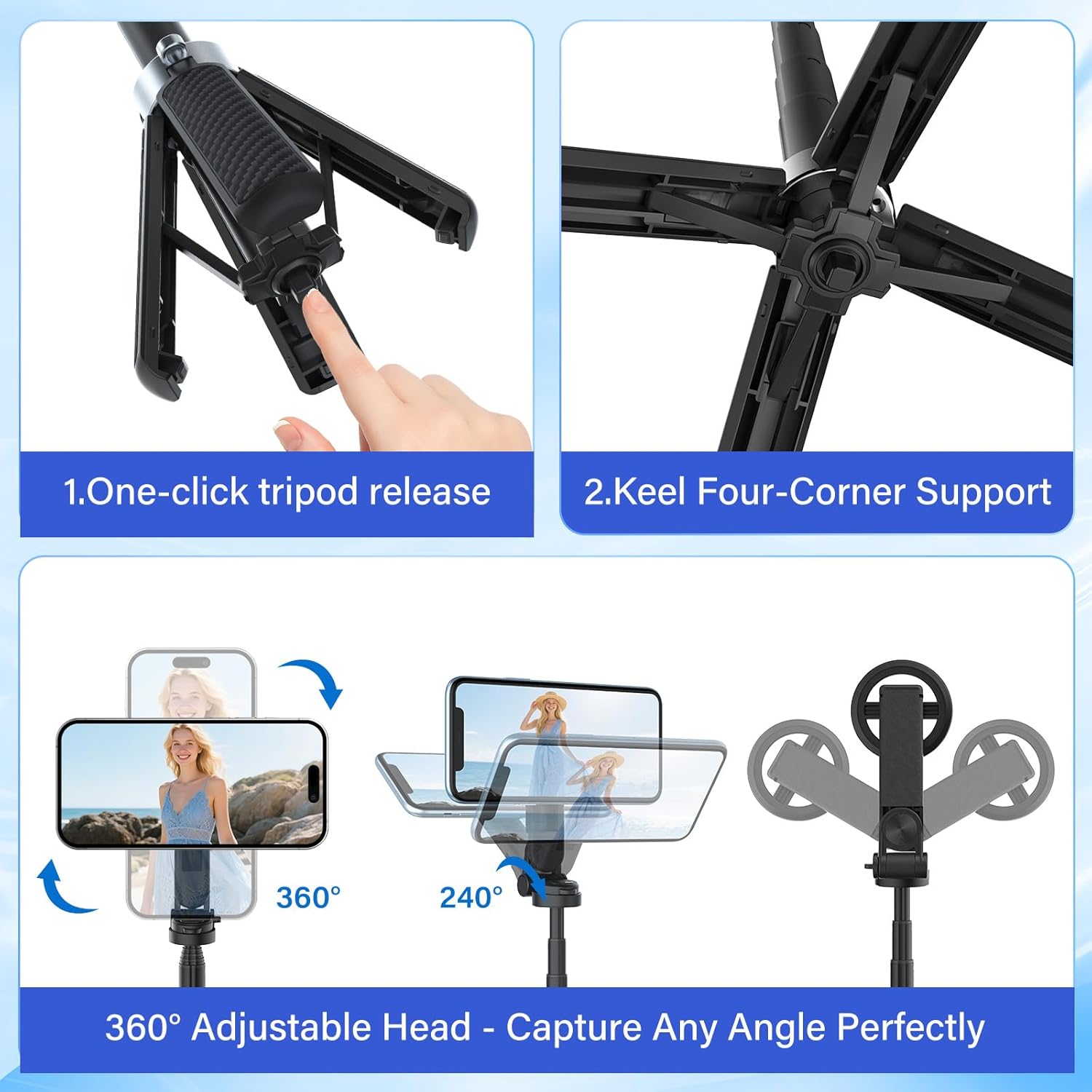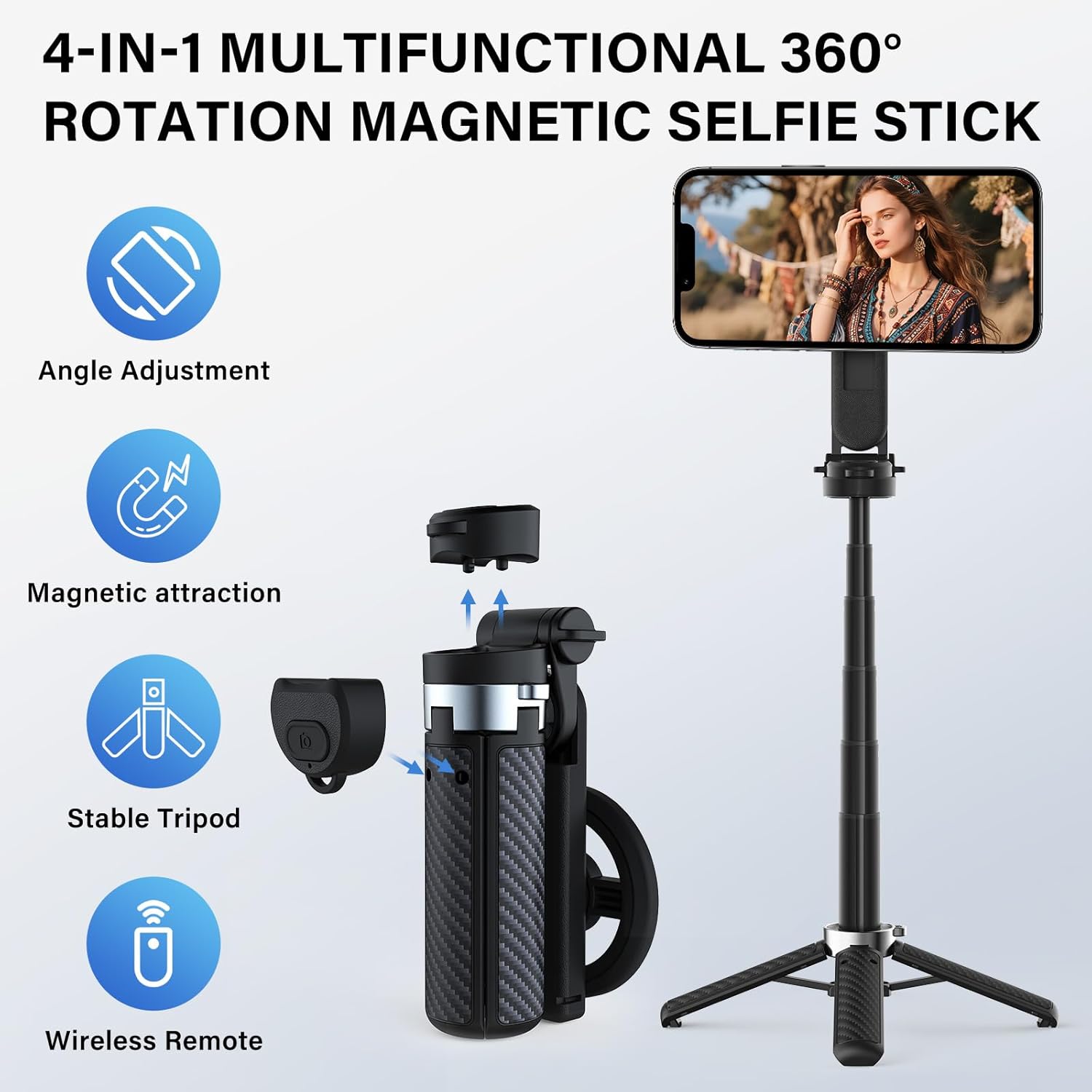 4-in-1 All-in-One Solution – Combines selfie stick, tripod, magnetic mount and Bluetooth shutter in one compact tool. Perfect for selfies, vlogging, video calls and travel content creation.