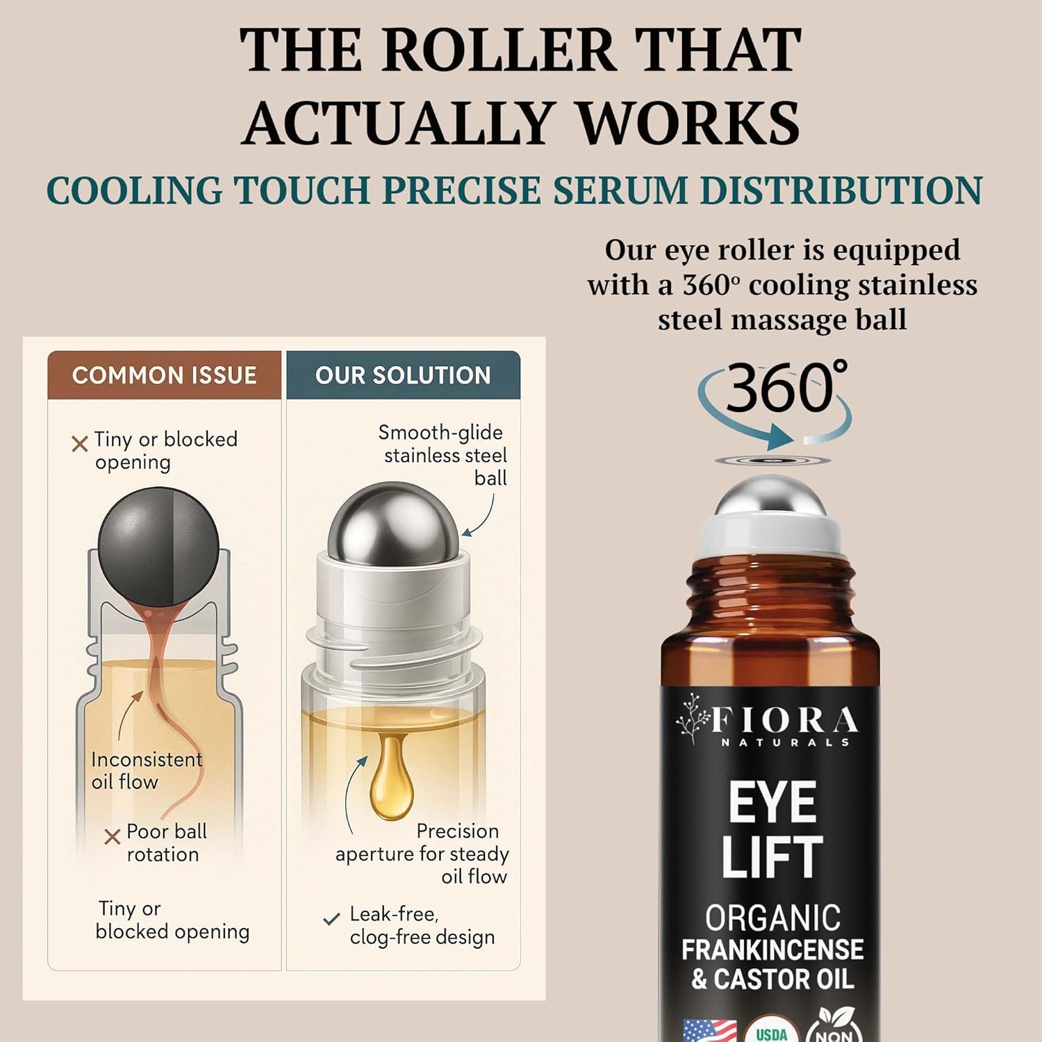 Organic Castor Oil and Frankincense Roll On – 100% Pure Hexane Free Eye Oil for Under Eye, Reduces Wrinkles, Dark Circles & Puffiness, Frankincense Essential Oil for Face Roller by Fiora Naturals