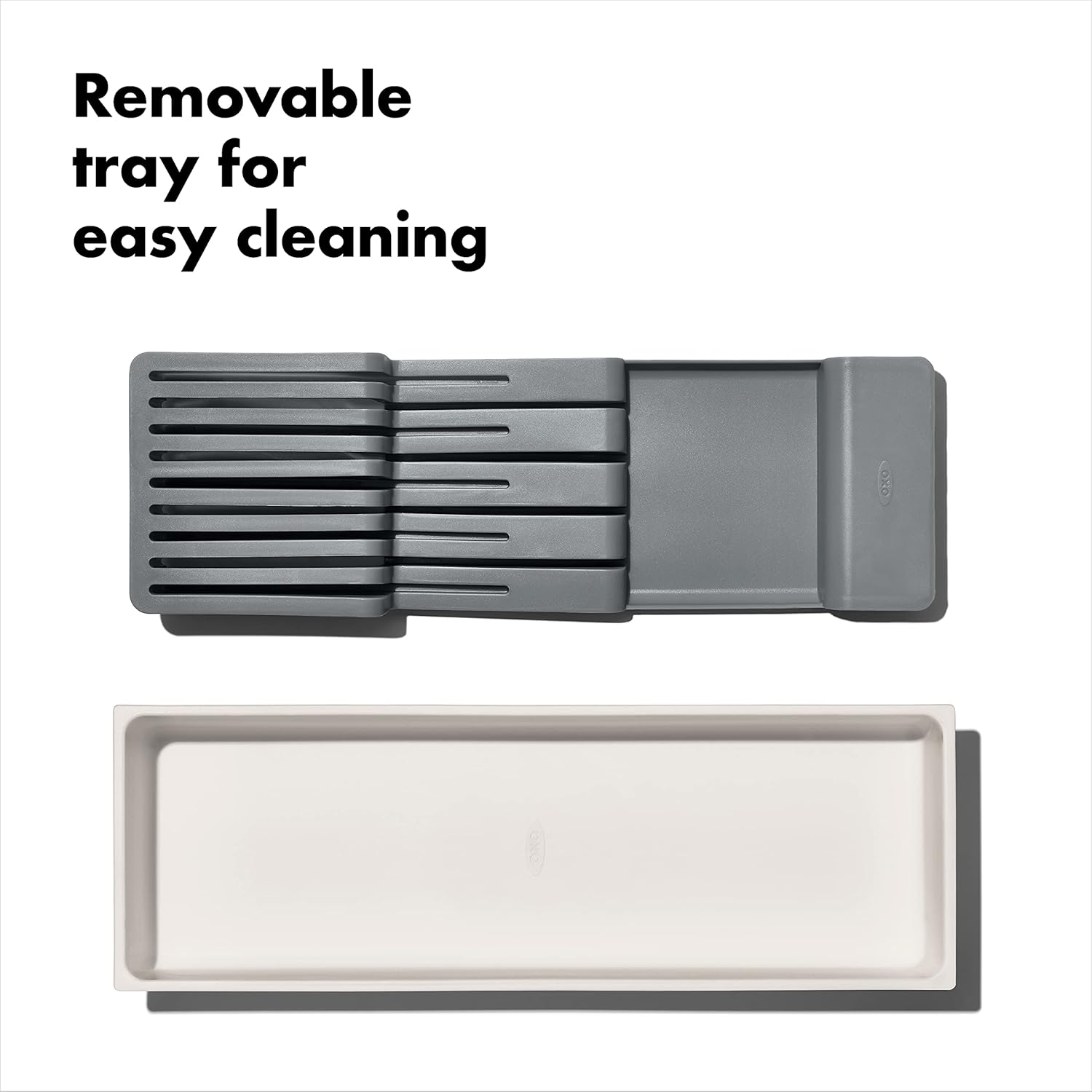 The OXO Good Grips Knife Drawer Organizer is the safe and tidy way to create a knife drawer with a custom look. Our Organizer holds five small knives and four large ones in a neat and compact tray to keep you safe when reaching into drawers and to protect your blades to help them last longer. The non-slip feet keep the Organizer in place when you open and close the drawer. The space-maximizing design features square corners to eliminate gaps and deliver a clean look in your drawers. The tray is removable for thorough cleaning.