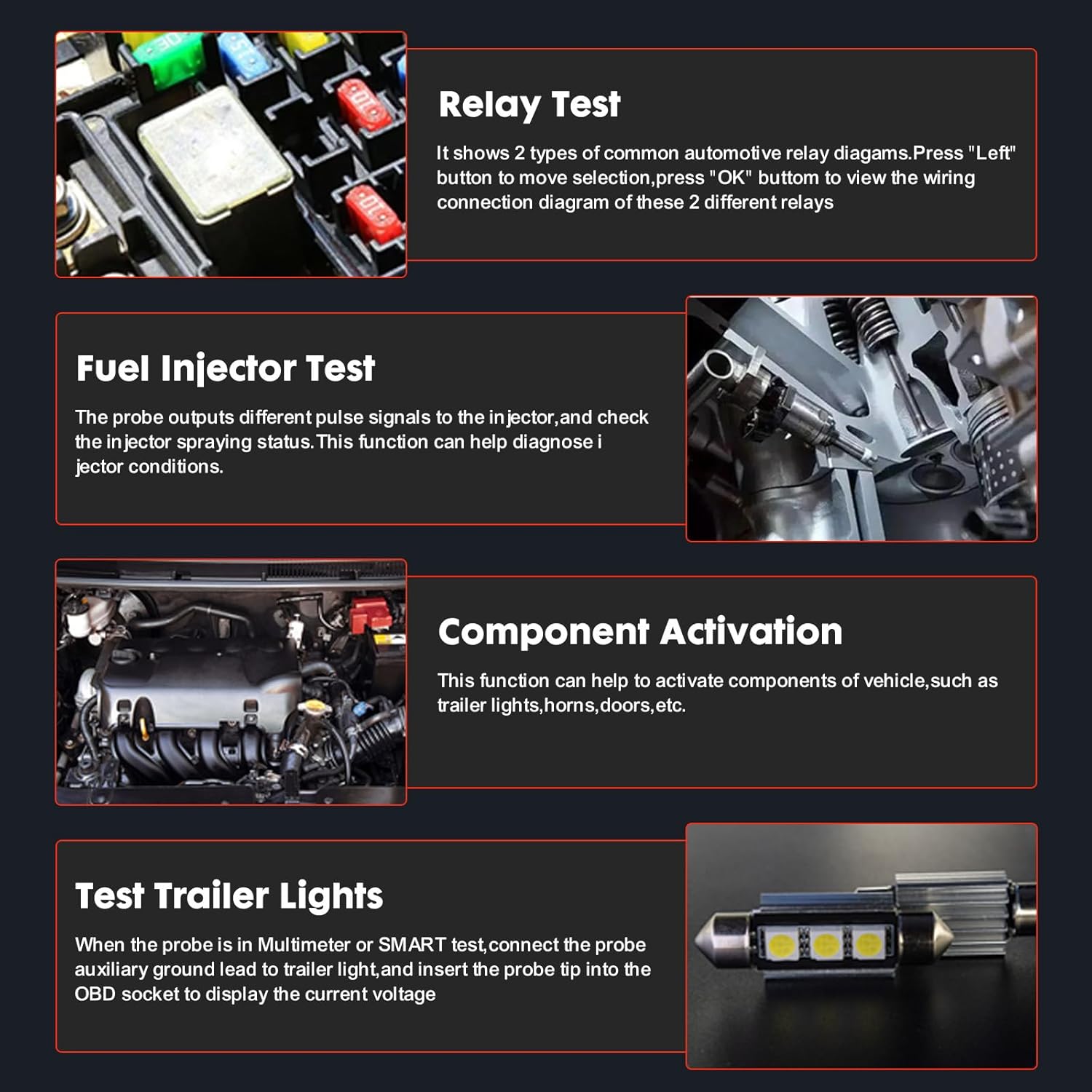 [Fuel Injector Testing] If the fuel injector is damaged, that will easily lead to engine idling instability, fuel consumption increase, cause engine shock. Also, Topdiag P200 power tester also a relay tester automotive kit, which will make it more convenient for the owner to check whether the fuel injector and other parts of the vehicle in a good condition regularly.