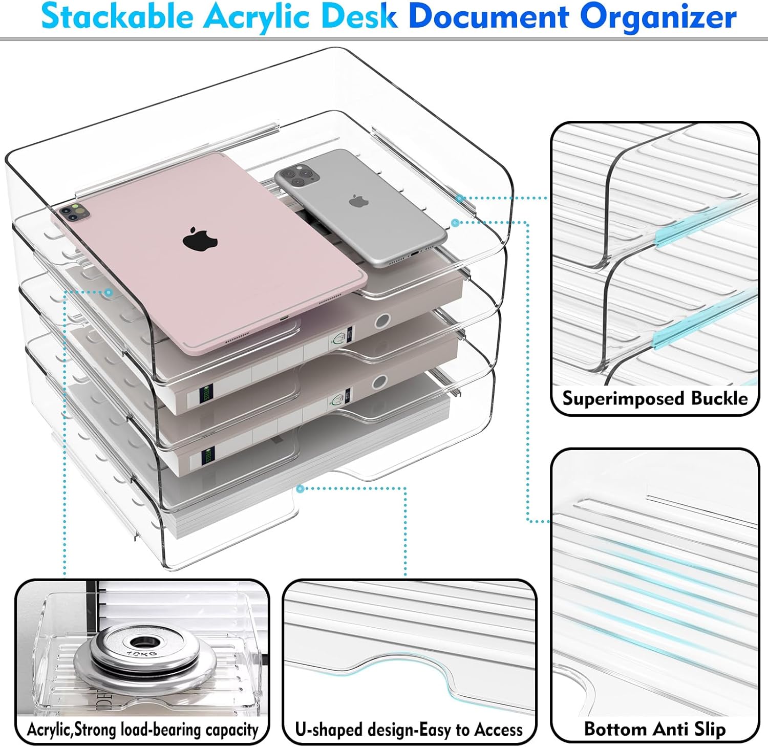 Paper Organizer Letter Tray, 4 Pack Acrylic Stackable Desk File Organizer,Clear Office Organizer for File Paper, Ipad, Letter, A4 Office File, Books, Notes, Etc