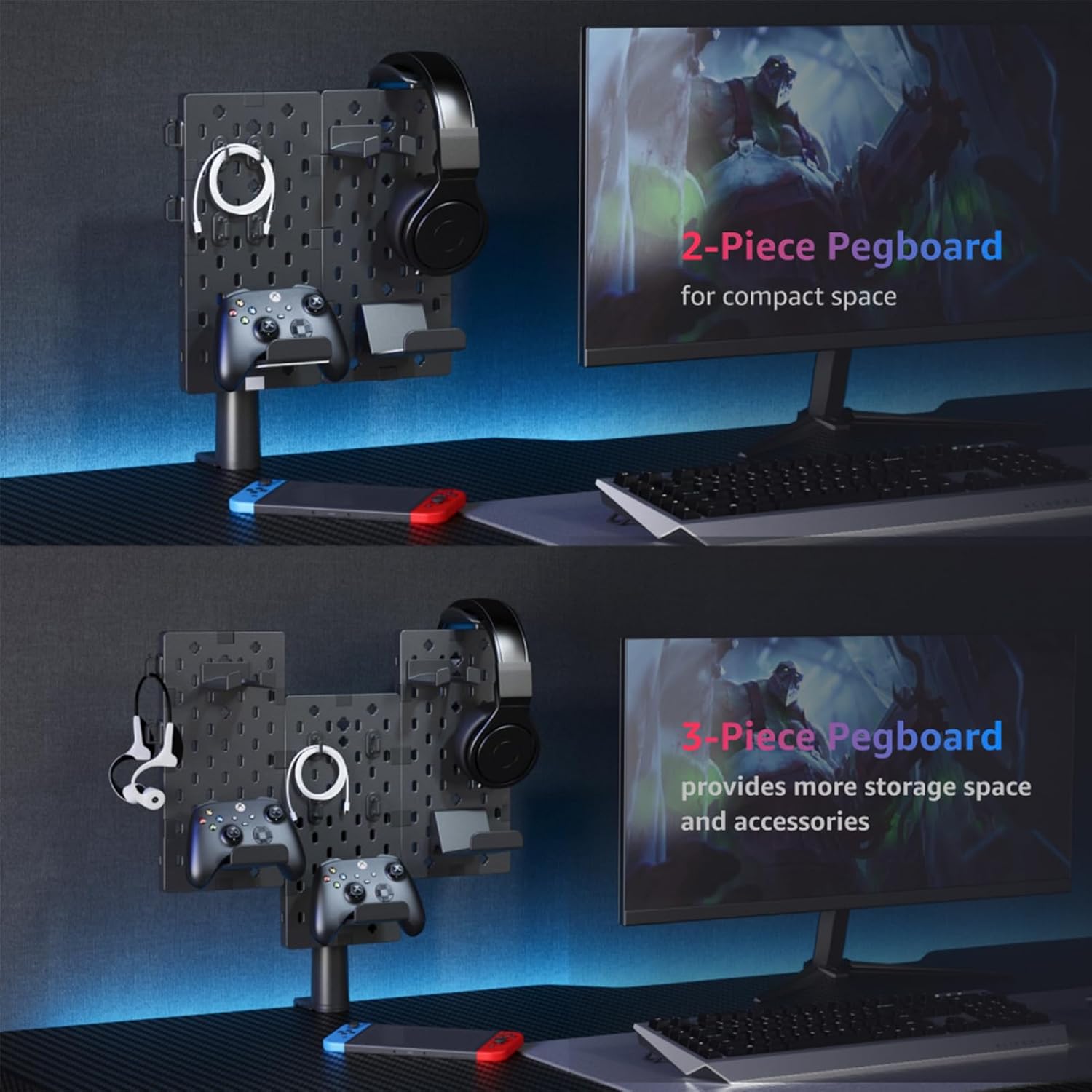 GAMING PEGBOARD FOR DESK: This controller and headset holder pegboard features a modular design that allows you to customize the storage and display of your gaming accessories. It provides a space-saving and versatile storage solution by joining 3 panels together with the fastener.