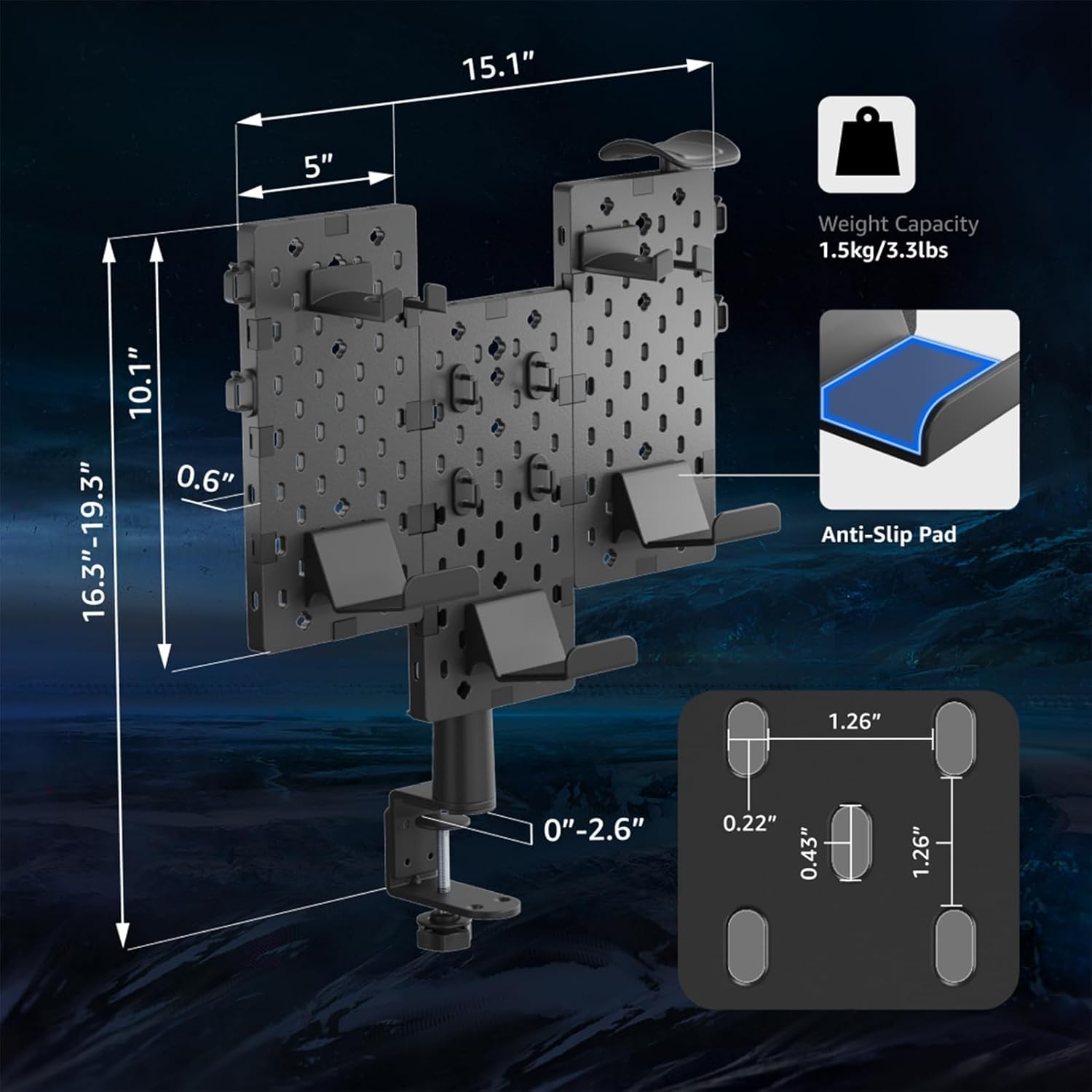 GET ORGANIZED FOR CONTROLLERS & HEADSETS: Designed specifically for gaming scenes, this clamp on pegboard comes with a variety of accessories, it can hold controllers and multiple types of headphones, and the included cable hooks can manage your cables to keep your gaming desk organized. The controller holders are attached with anti-slip rubber to prevent slipping. Give your controllers and headphones a safe home.