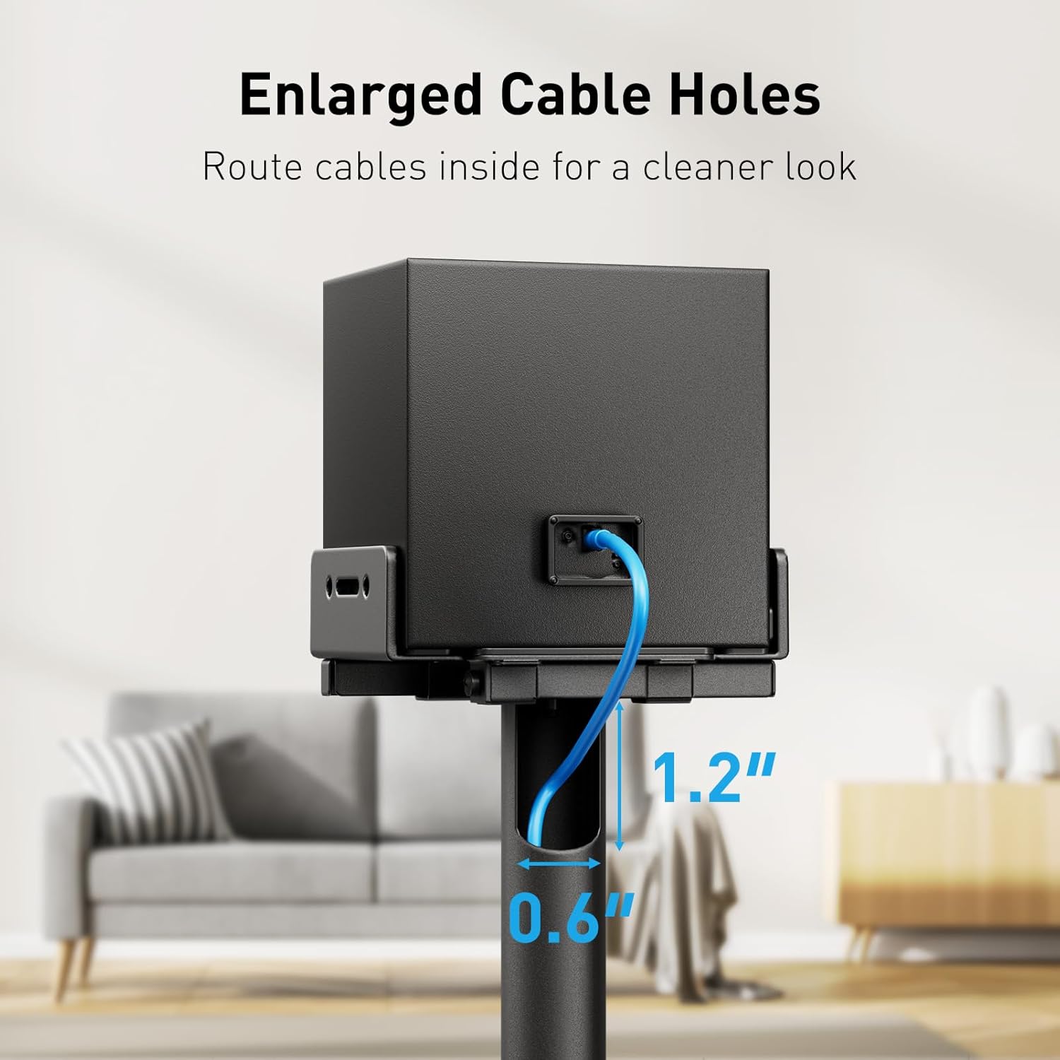 【HIDE WIRES & EASILY INSTALLATION】 The PSSS2 smart speaker stands come with a large hole (1.18″H x 0.59″W) to manage your cables for a clean and tidy appearance. You can easily pan the top plate 180 degrees from 5.91 to 11.22 inches to fit your various speakers of different sizes.