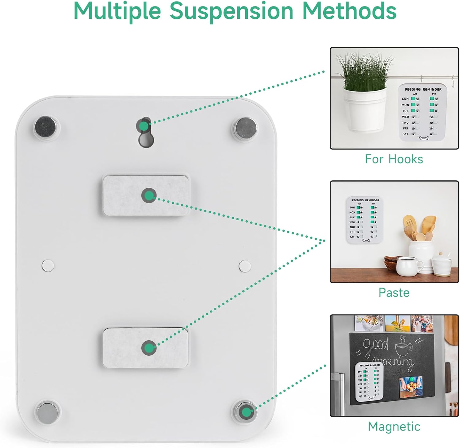 Customers find the pet feeding reminder effective and easy to use, with strong magnets that stick firmly to the fridge. They appreciate its quality, appearance, and size, with one customer noting it’s small enough to place on top of the food container. They like its tracking capabilities, with one mentioning it helps keep track of insulin shots, and find it helpful for families, particularly those with ADHD or busy households.