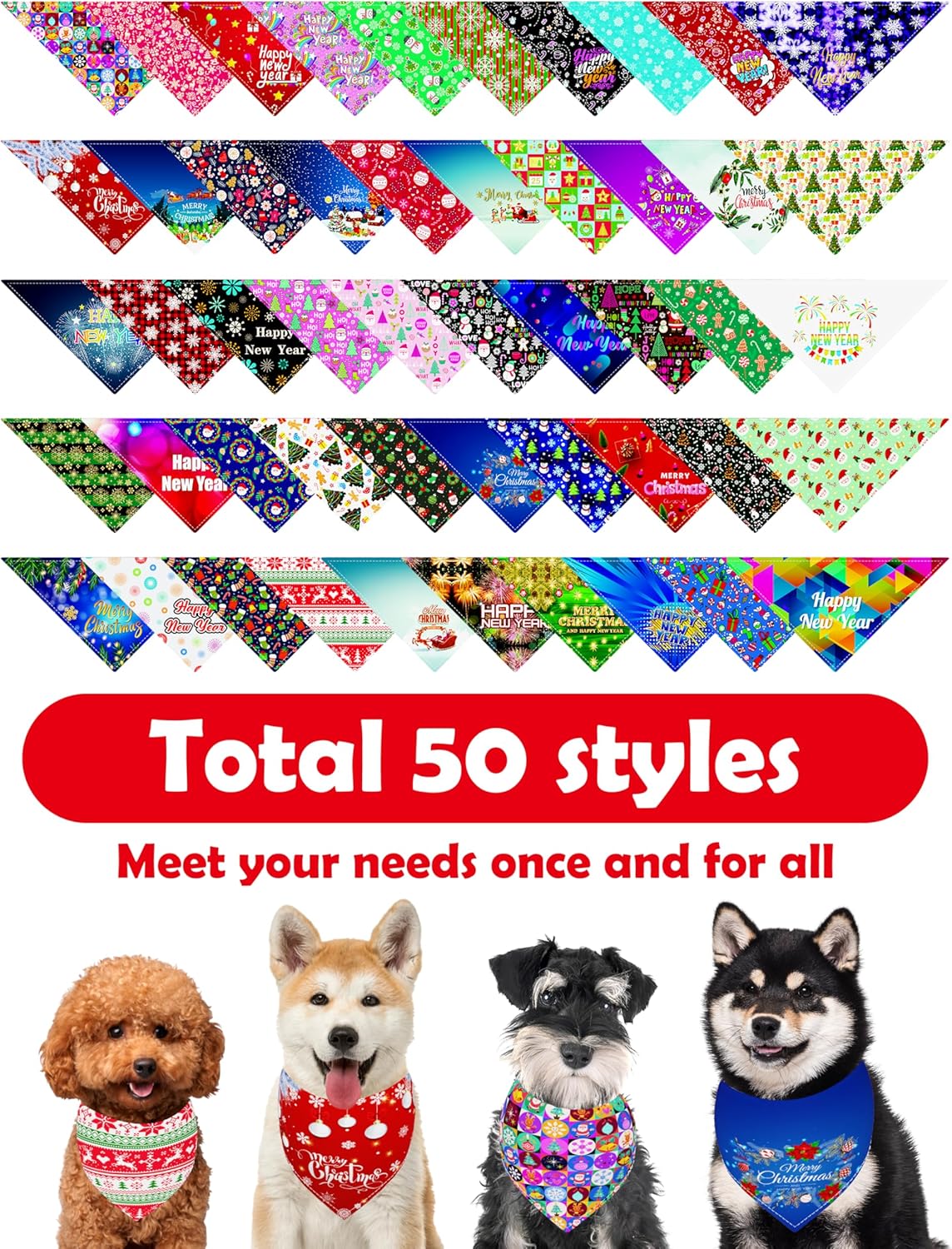 Multiple Holiday Design: The package includes 50 pieces/pcs triangle dog bandanas in total with 35pcs Christmas and 15pcs Happy New Year festival theme patterns include Santa Claus, Christmas trees, snowflakes, snowmen, moose, candy, happy new year etc. Colors include red, green, purple, black, golden, white, pink and blue. Cute patterns will make your doggies get many compliments, they are full of holiday atomosphere and will add a lot of charm to your pets