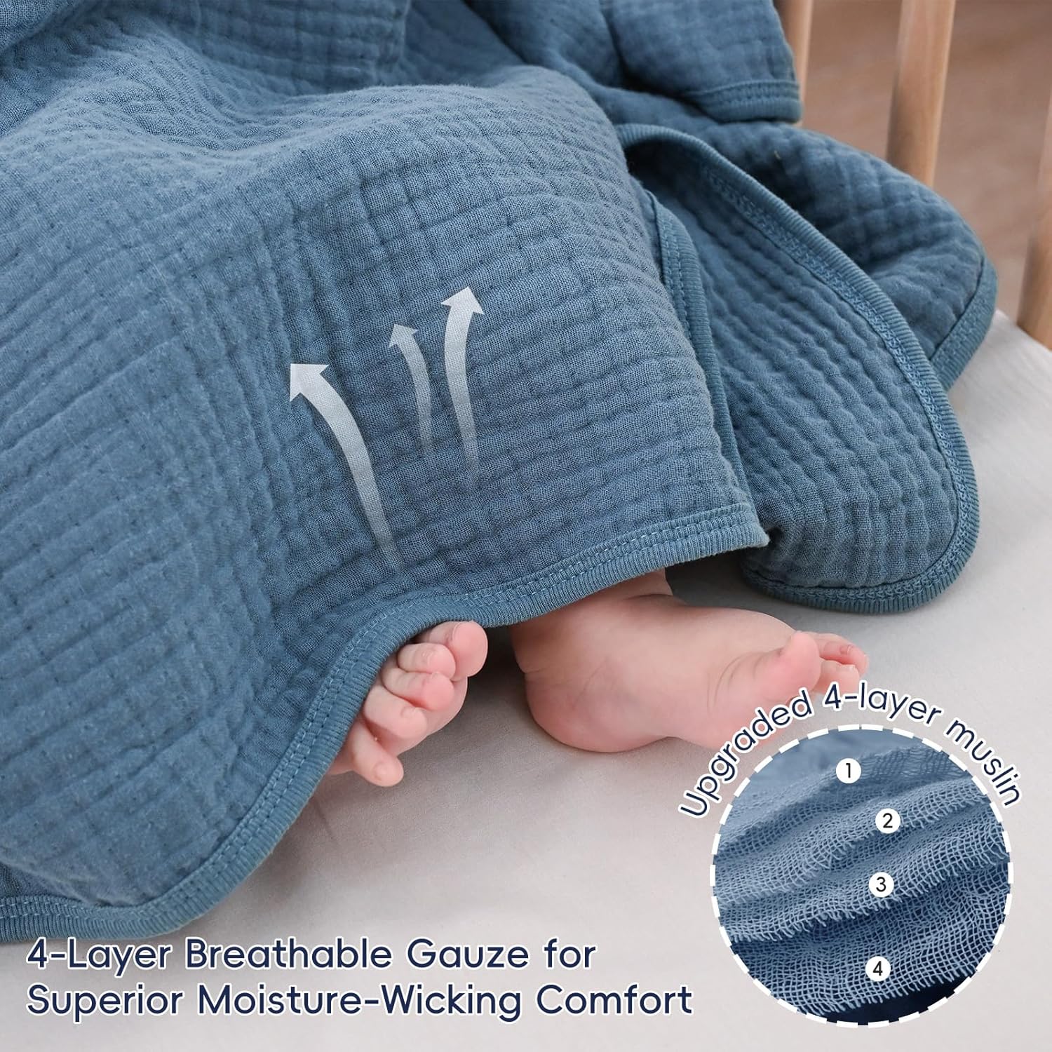 Crafted with 4 layers of breathable muslin for superior softness and airflow, this ultra-lightweight baby blanket keeps your baby perfectly cozy while preventing overheating. Gentle on delicate skin and naturally temperature-regulating, it’s the safest, comfiest choice for you and your little one’s sweetest dreams.