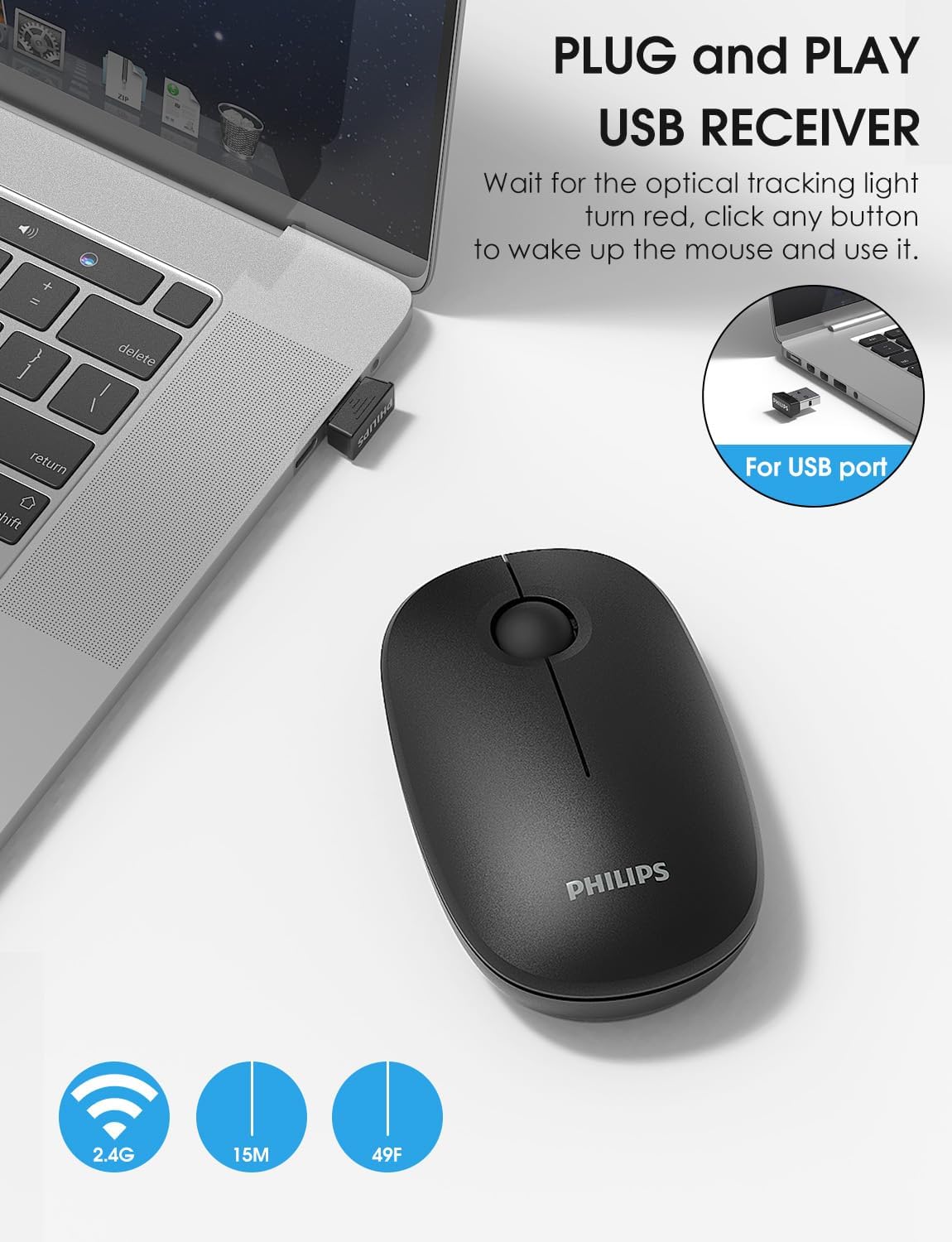 【Plug & Play】Just plug in the 2.4GHz USB receiver and start working in seconds with a strong, reliable connection to your wireless computer mouse up to 49 ft/15 m.