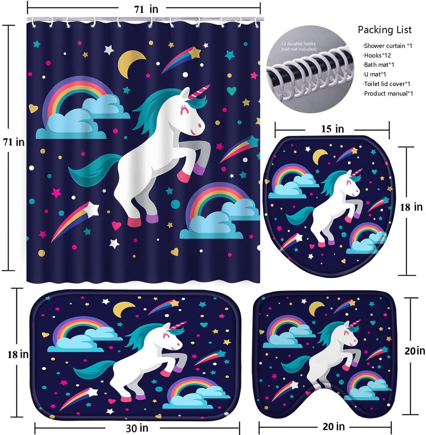 【Perfect Sizes for Your Bathroom】This bathroom combination decoration set suitable for most bathroom environments. Perfect sizes as follow: Waterproof shower curtain:72″L X 72″W, O shape toilet lid cover mat: 18″Lx16″W, Non-slip bath rug: 30″L X 18″W, U shape rug size: 20″ L X 20″ W. The plus size and thicker material enhancing the practicality and functionality of this nice set.