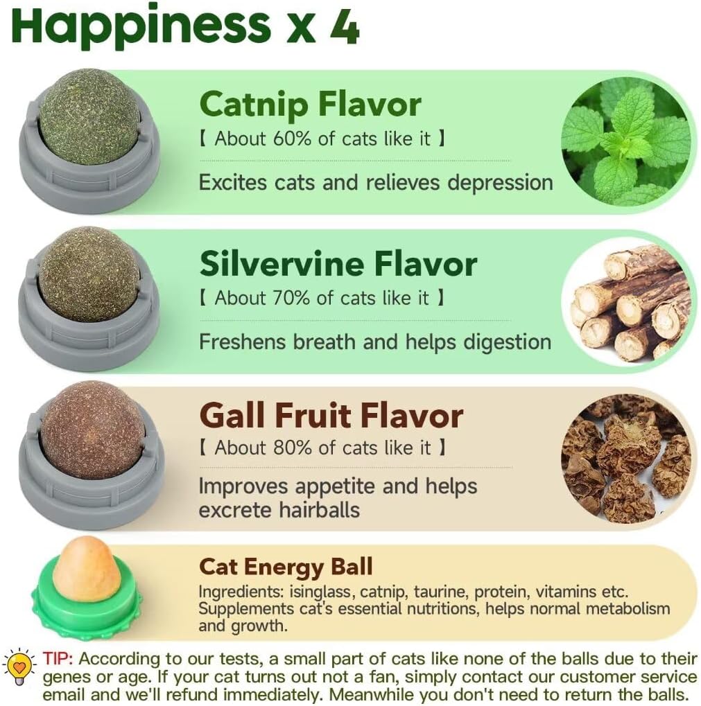 100% Natural and Non-toxic: the catnip balls are made of pure natural plant extracts, no chemical additives contained. Rest assured this toy is no harm to your favorite kitty. Includes 4 different flavors: “catnip”, “silvervine”, “the fruit of silvervine” and “cat energy ball” that conspire to arouse your cat’s interest to lick and play