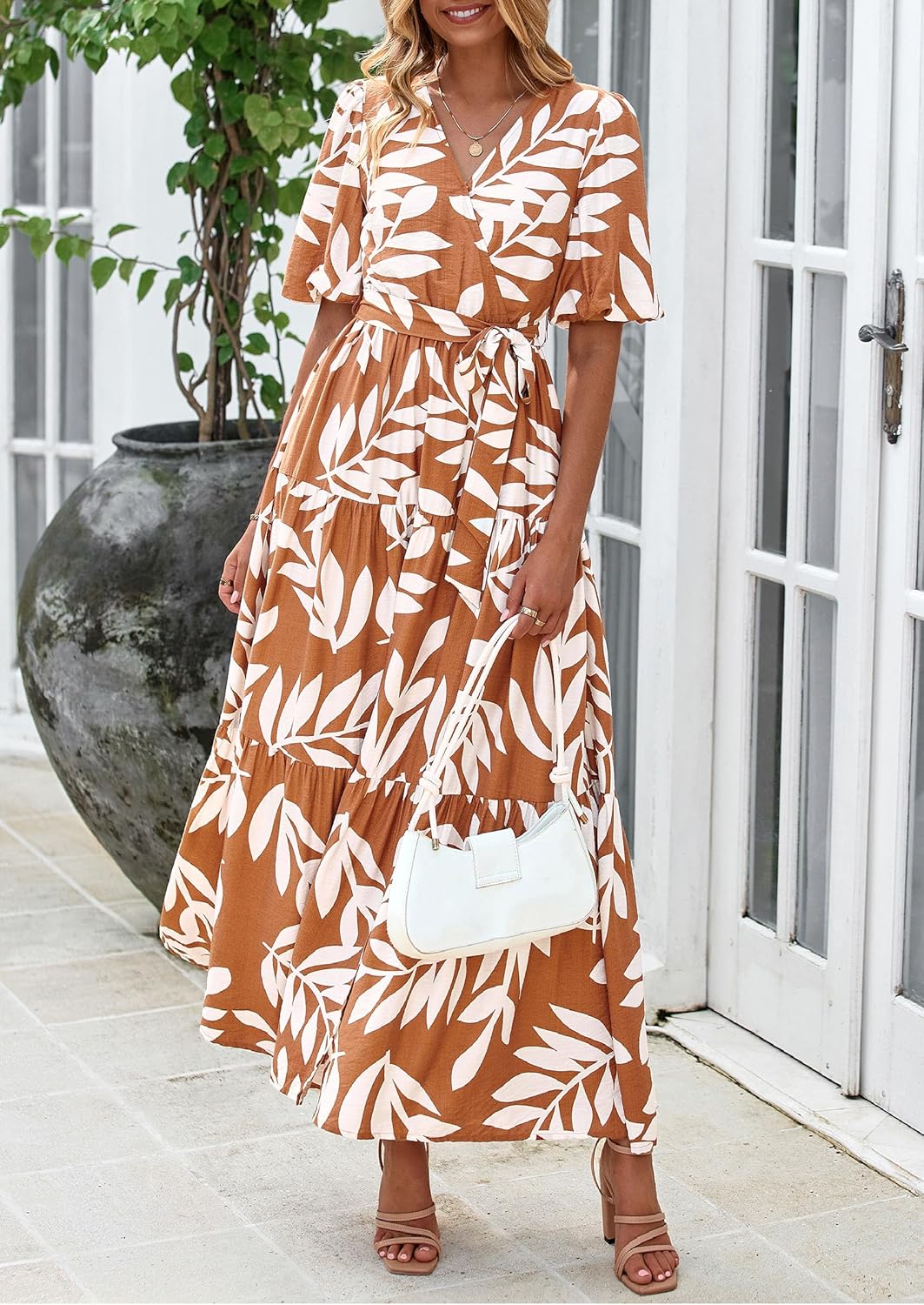 Fashion Style:Floral Printed/Maxi Length/Swing Dress/Puff Short Sleeve/V Neck Dress With Belt/Puff Sleeve/Long Dresses With Pockets