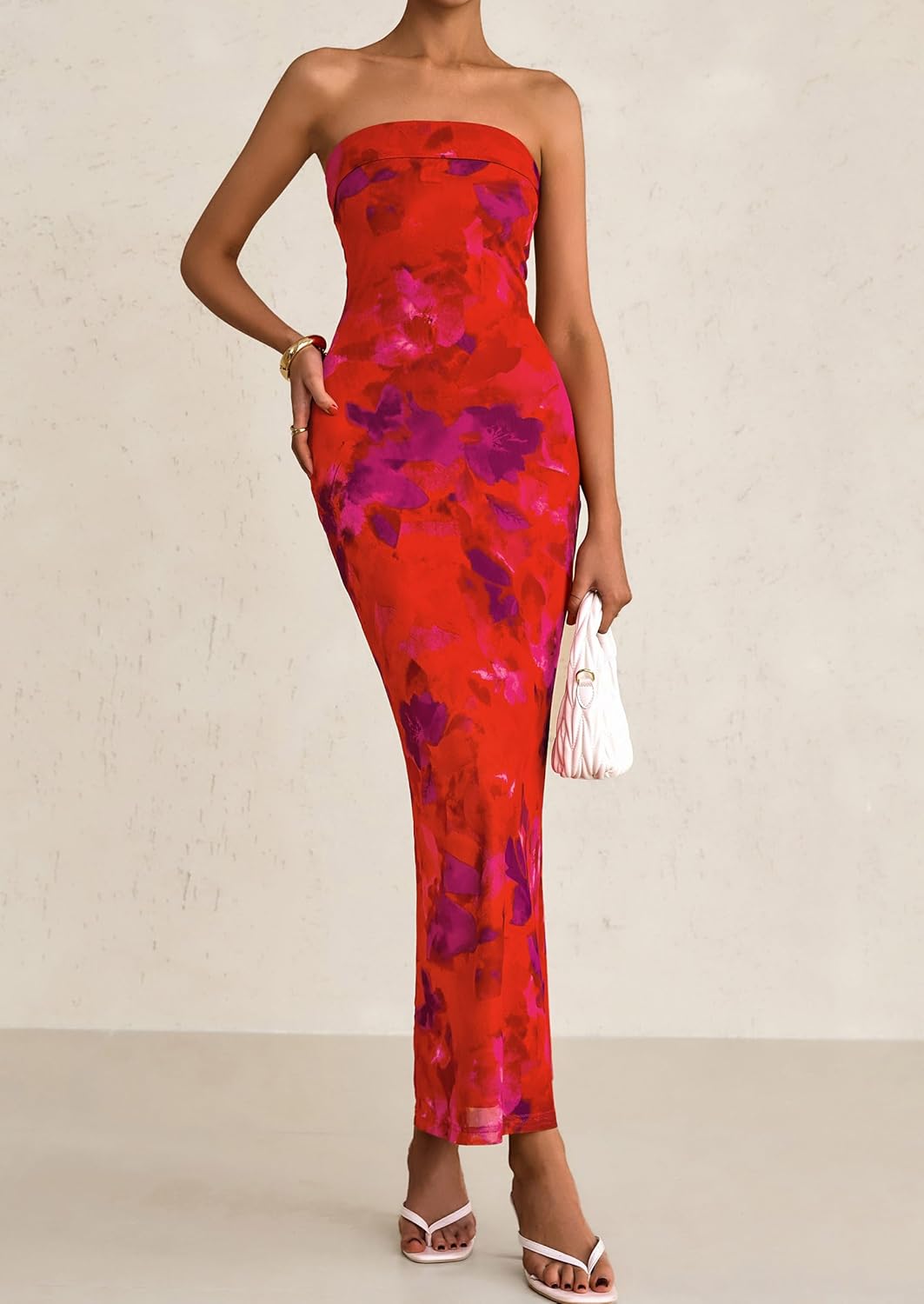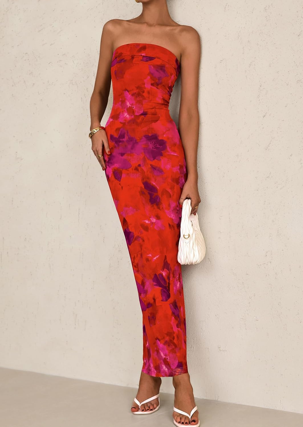 PRETTYGARDEN Womens Tube Top Dress Printed Bodycon Strapless Maxi Dresses