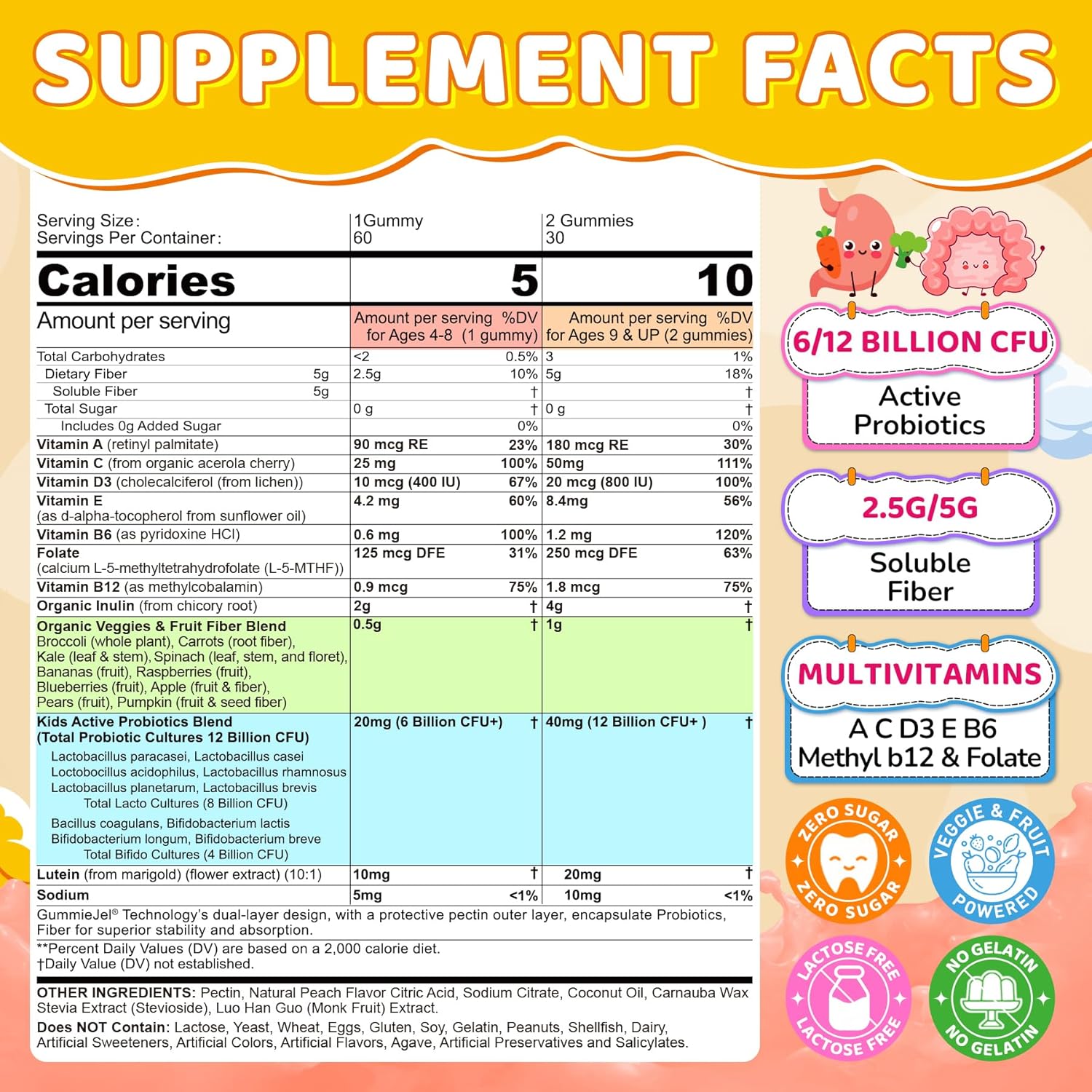 Probiotics for Kids Teen + Veggie & Fruit Fiber Gummies, with 12 Billion CFU Probiotic, Organic Inulin Prebiotics Fiber, Methyl B12 B6 C for Children’s Digestive & Gut, Immune Health, Sugar Free,60Cts