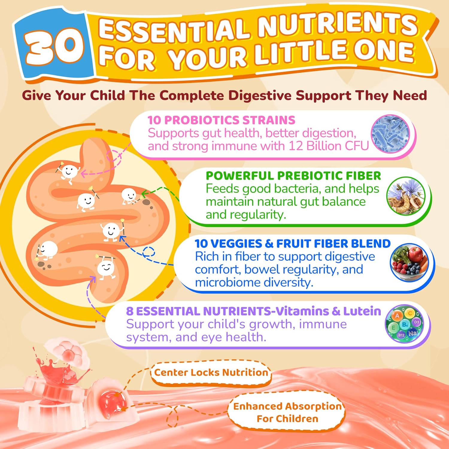 🍑Delicious Kids Probiotic & Fiber Liquid Gummies: Is your child picky about food? Irregular? Lacking fiber? Our full-spectrum probiotic & fiber gummies are designed to support your child’s digestive health and overall well-being.Using GummieJel technology, active ingredients like probiotics and fiber are encapsulated in the center to improve bioavailability,which ensures that they reach the gut intact, promoting a healthy tummy and improving digestion without the struggle of mealtime battles.