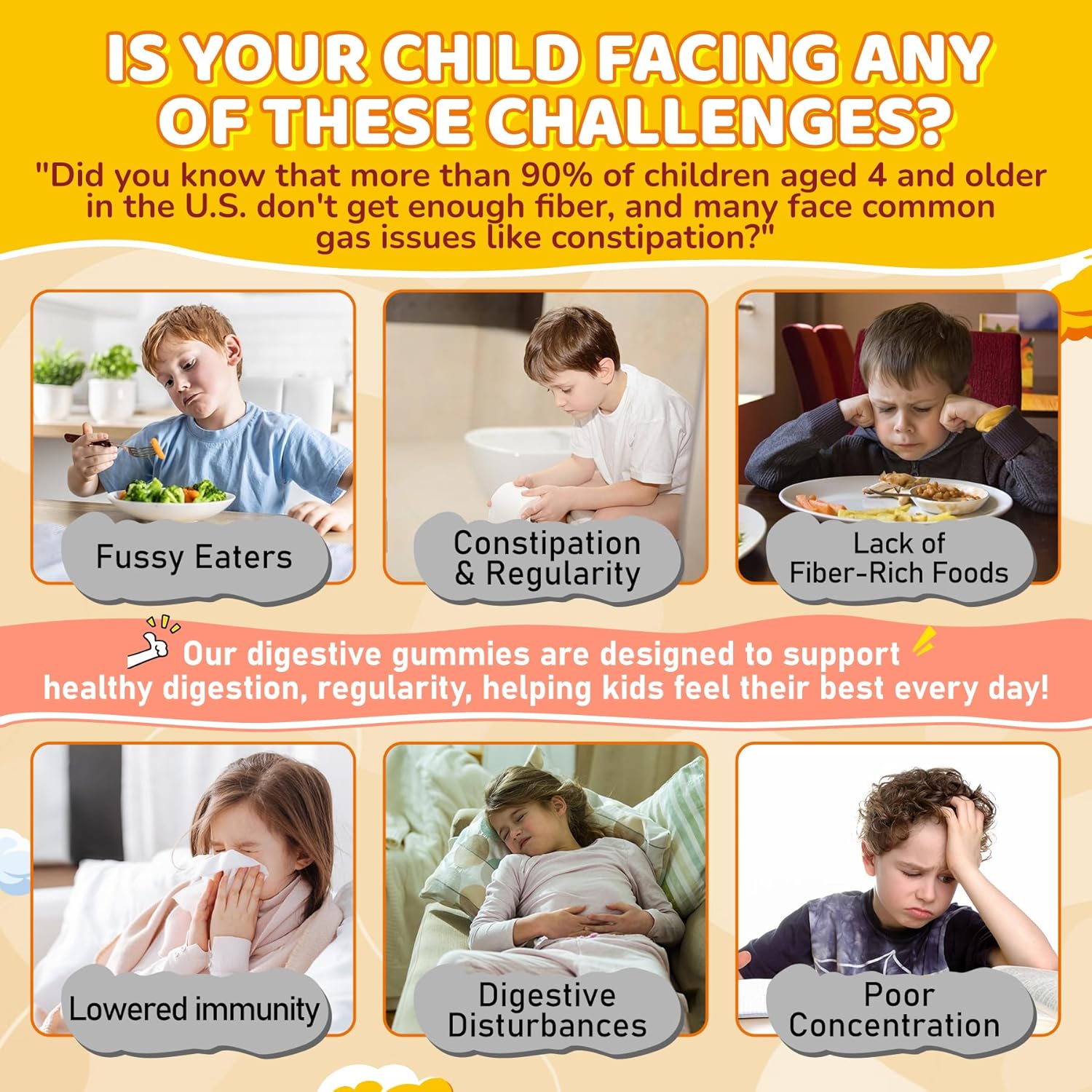 🌿 10+1 Superfood Fiber Blend – 5g Daily Gut Fuel: This powerful blend delivers 5g of total dietary fiber from 10 fruits and veggies plus prebiotics inulin to nourish your child’s gut and support healthy digestion.Added plant-based fiber sources to provide natural digestive support and essential nutrients.Inulin from chicory root helps feed good bacteria and maintain gut balance.The easy-to-enjoy gummy supports smoother digestion and regularity—no more mealtime struggles or picky eating battles.