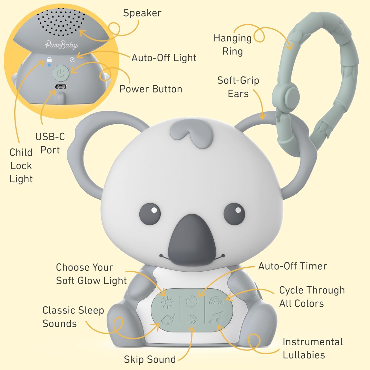 Pure Enrichment PureBaby Hanging Koala Sound Machine – Portable Travel Sleep Aid/Night Light & Detachable Hanging Ring – White Noise, Hush, Lullabies & More Sounds for Car Seat, Stroller & Bassinet