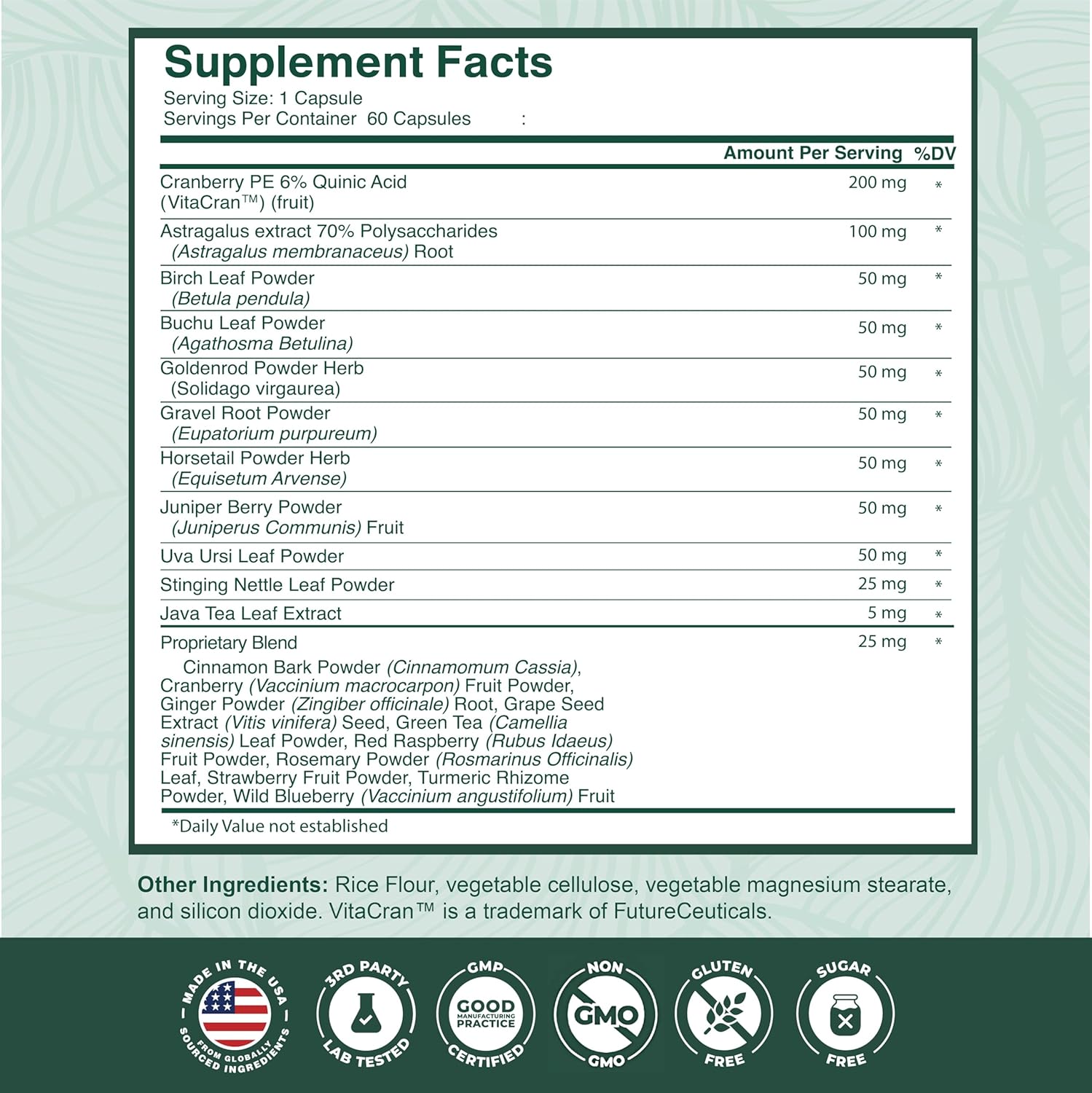 ADVANCED CRANBERRY SUPPLEMENT: Our kidney health supplement offers a variety of nutrients for optimal kidney support. Each capsule includes cranberry powder, astragalus, ginger, turmeric, and grape seed extract supporting kidney flush and bladder heath.*