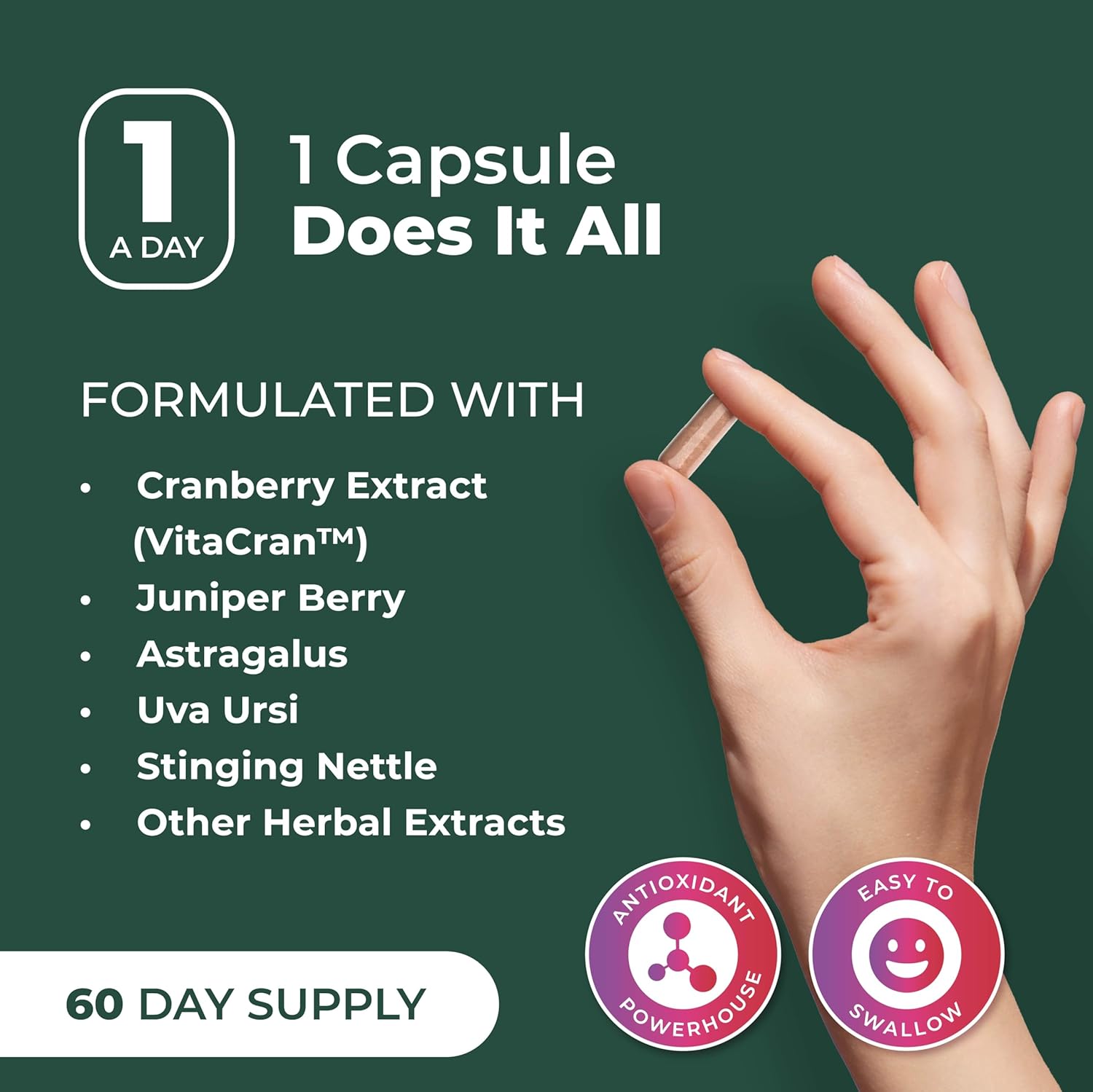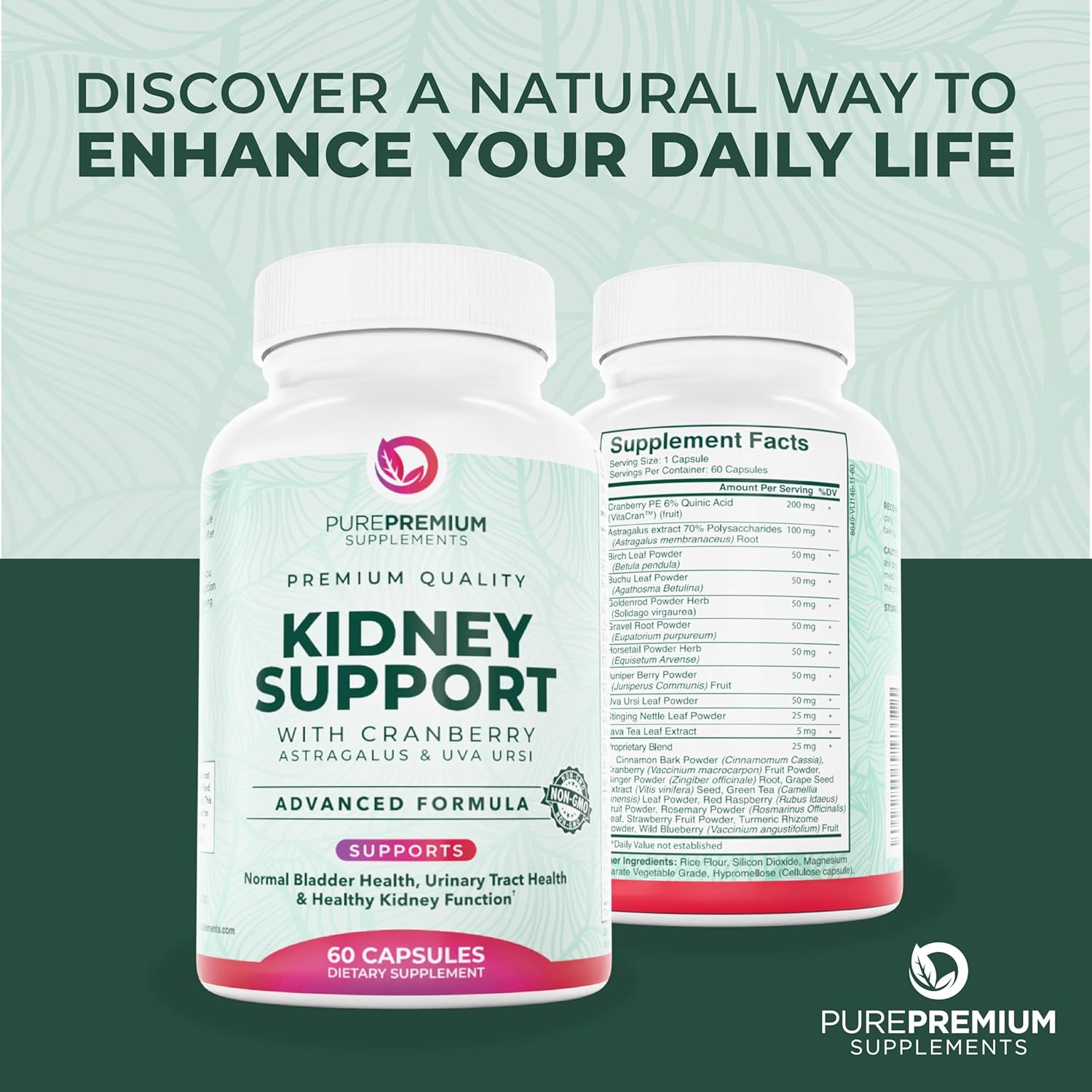 21 NATURAL INGREDIENTS: PurePremium kidney supplement combines 21 powerful ingredients, including nettle leaf, juniper berries, uva ursi, chanca piedra. Support your kidney detox effectively and simplify your health routine with our cranberry pills.*