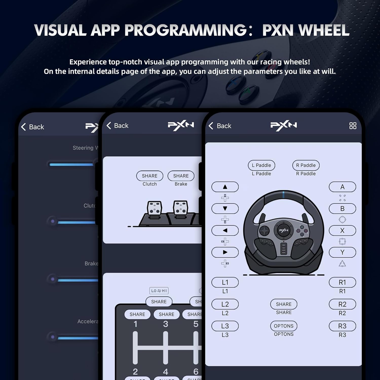 ✅【Visual APP Programming】:Experience top-notch visual app programming with our racing wheels! Find the “PXN Wheel” app on Google/Apple App Store for easy installation.including high and low sensitivity adjustments. Save multiple game key settings hassle-free, ensuring seamless gaming every time. high-quality construction with non-slip ABS matte material and real dual vibration motors. Secure them firmly with 5 suction cups and 2 C-shaped fixing brackets for maximum comfort and gaming pleasure.
