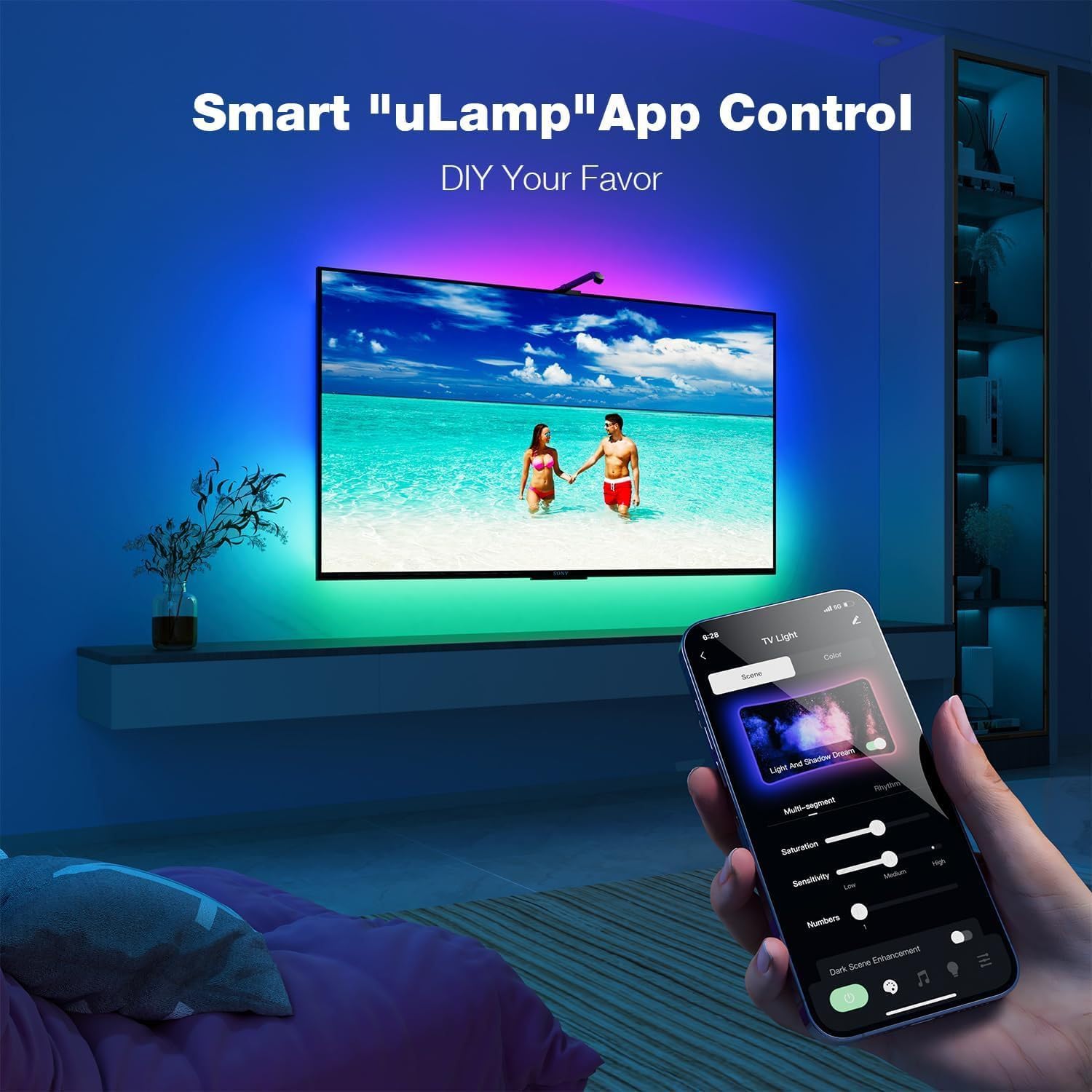 Smart APP application: Easily control or customize the TV backlight through the “uLamp” APP application. Very interesting and flexible customization function, you can customize your own light show through the application and customize the atmosphere you want for each scene.