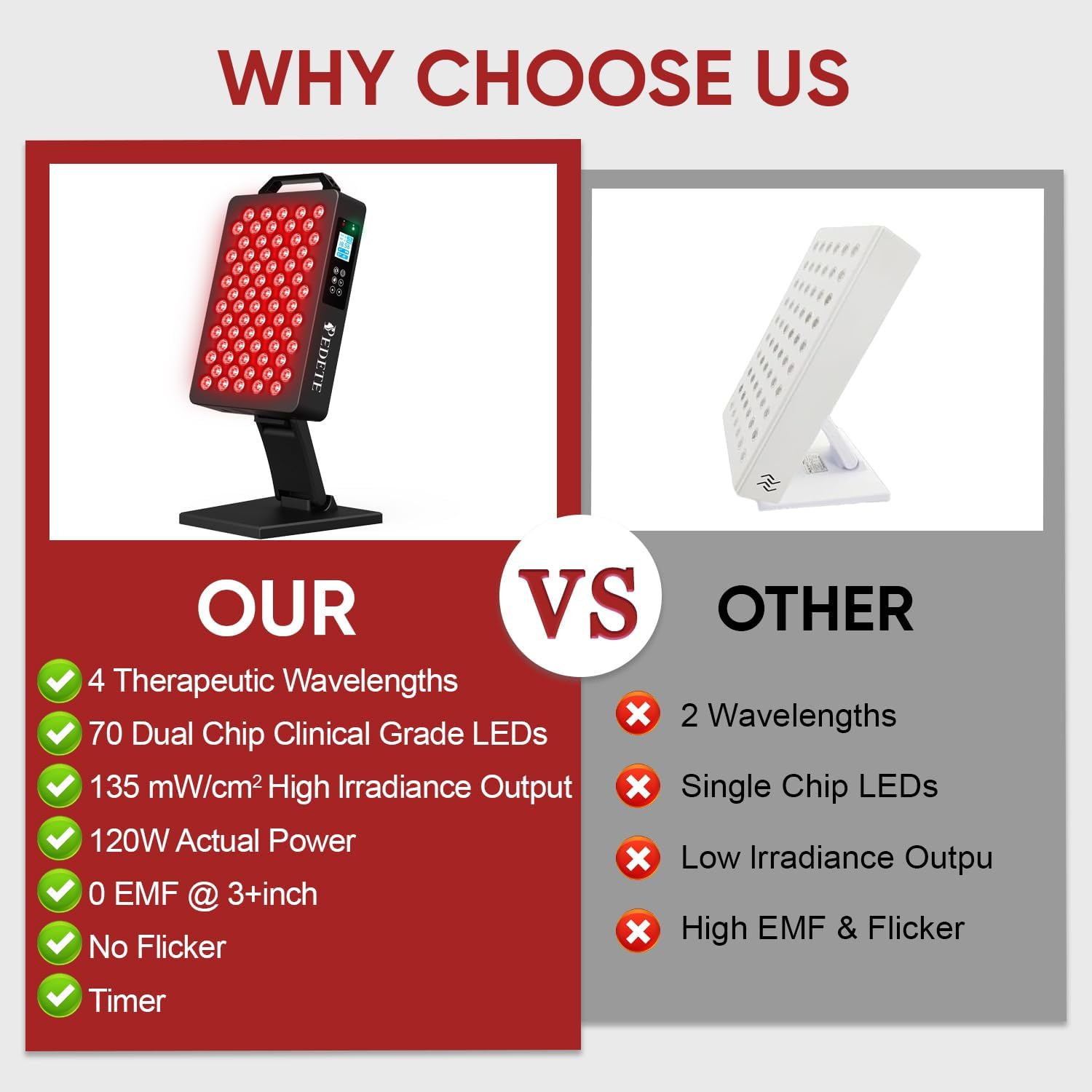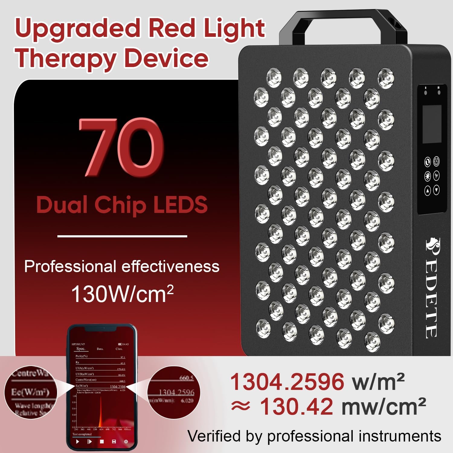 【70 Dual Chip Led Light Therapy】Pedete’s red light therapy for face features 70 flicker-free, 5W dual-chip LEDs that emit red and near-infrared light at a precise 1:1 ratio. This configuration effectively doubles the light output to 120 beads, delivering higher irradiance for enhanced results. Each LED is engineered with a 60-degree beam angle, ensuring uniform penetration across targeted areas for maximum coverage and therapeutic effectiveness.