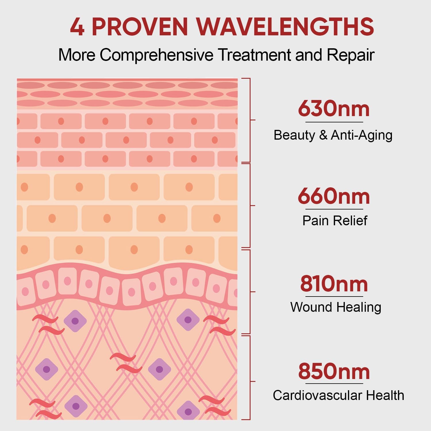 【4 Specific Proven Wavelengths】Our red light therapy for face and body delivers 4 proven wavelengths. Besides the standard 660nm red light and 850nm near-infrared light, we have also incorporated proven 630nm & 810nm wavelengths capable of delivering powerful results for superficial, localized and deep tissue. These wavelengths are ideal for skin health, increased blood flow, enhanced energy and performance, improved mental clarity, pain relief, sleep optimization and more!