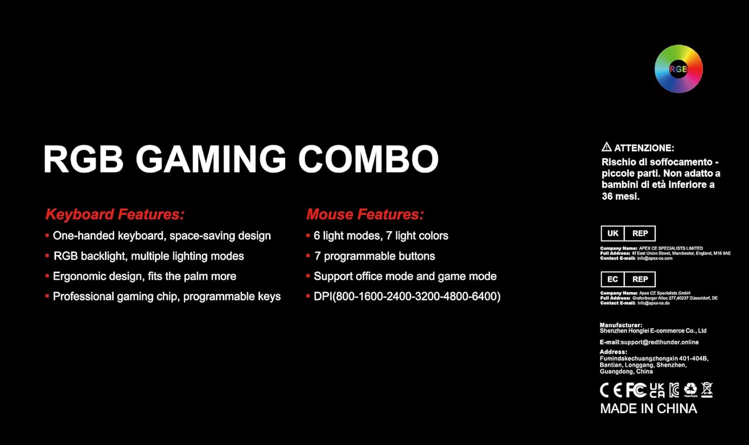 Built-in game chip, all 35 keys anti-ghosting, suitable for almost all PC games. Two macro recording keys give you more possibilities for operation. The big wrist-rest and ergonomic design provide you with a relaxing gaming experience. Its small size design makes it not only easy to carry but also saves you space. The RGB backlit supports breath mode and static mode, there are 7 colors to choose, the cool lighting effect will bring you more fun for game.