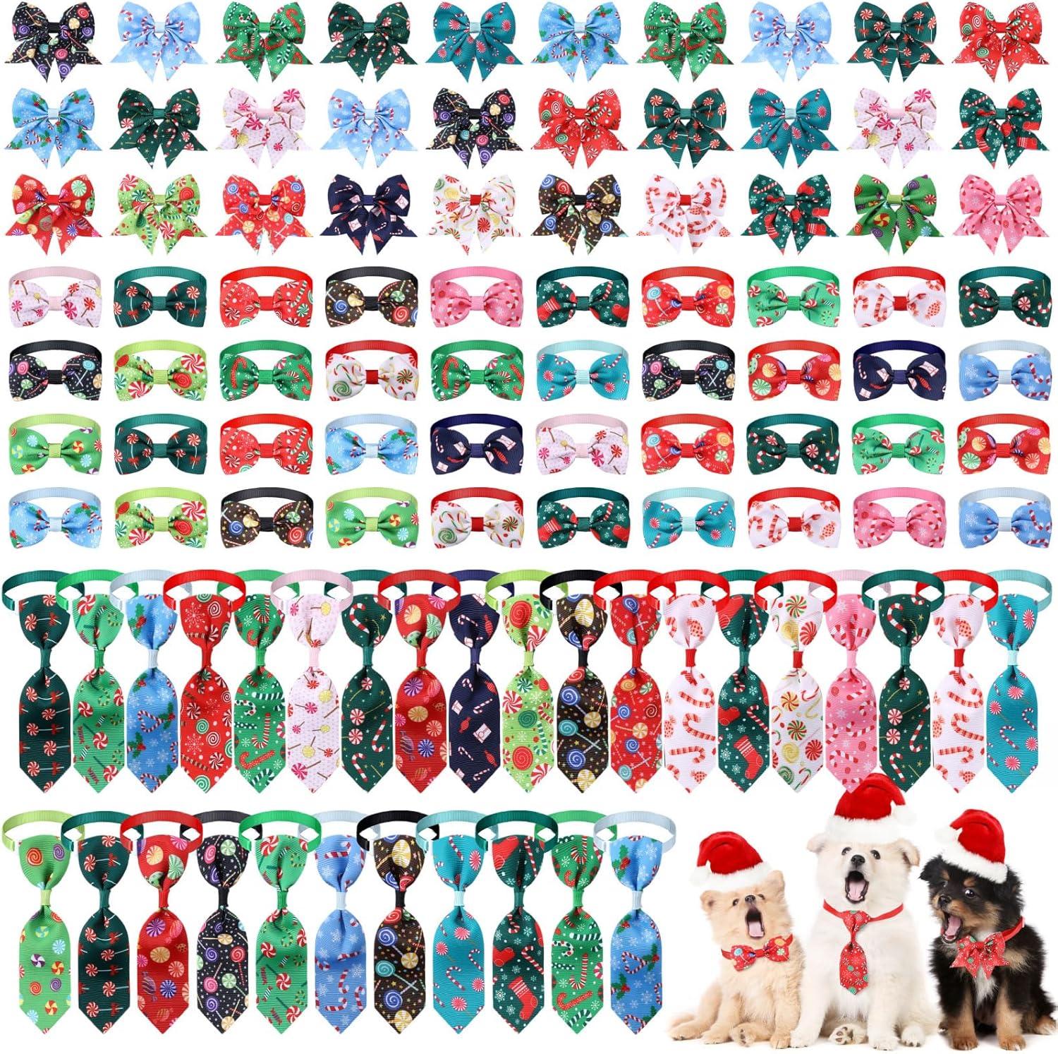Christmas Candy Themes Set: you will receive 100 Christmas pet collars; Christmas candy themes suitable for your pet daily wear and replacement needs, different styles and colors are cute and eye catching, You can dress up your pet with these lovely pet tie, making it become the focus of the crowd