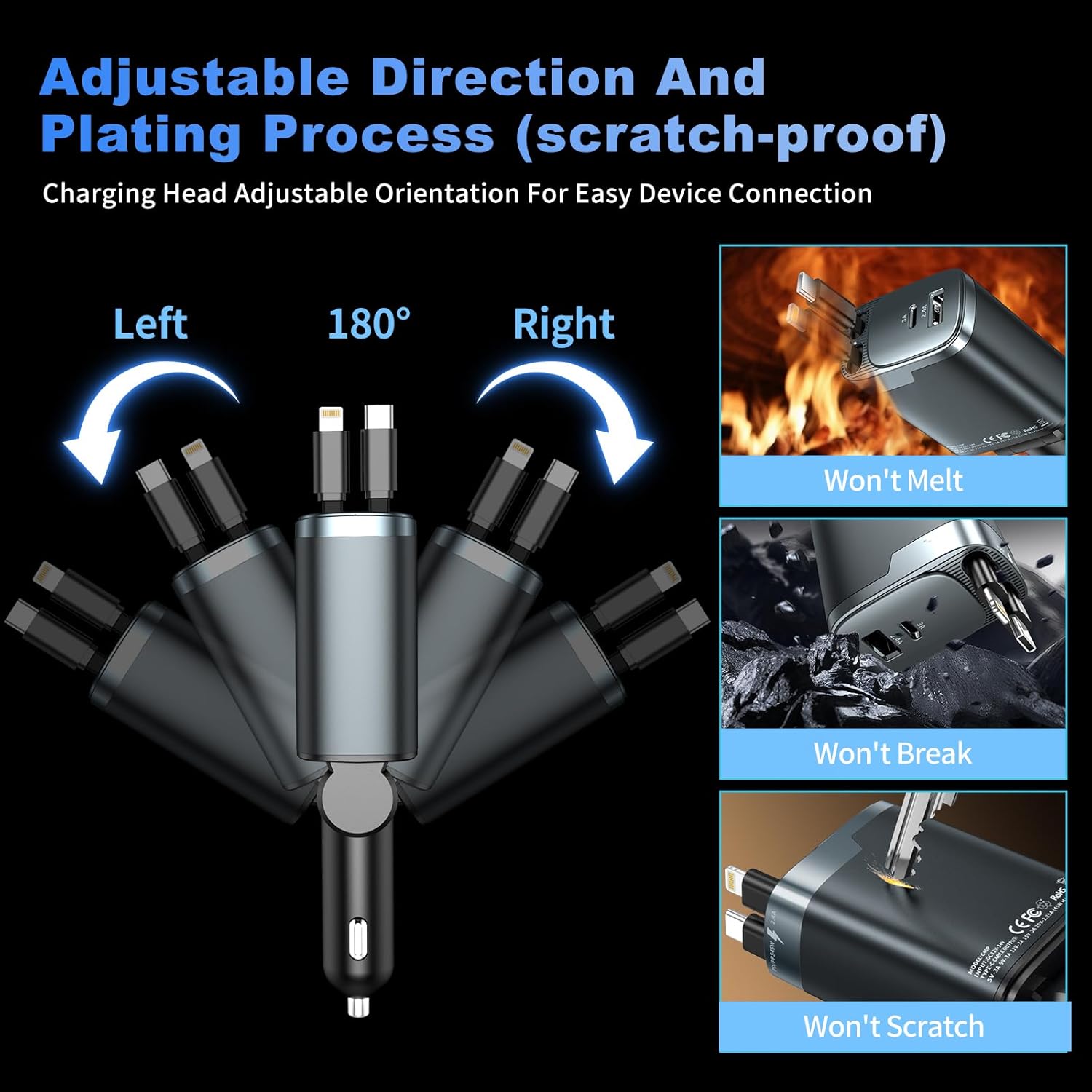 Upgraded 4 in 1 Retractable Car Charger: The 4 in 1 retractable car charger Combines a Compact Design With Powerful Performance, Its 180° Rotating Plug fits Standard 12V-24V Vehicle Sockets. The Retractable Cord Extends up to 31.5 inches, car charger includes 2 retractable cable(Usb C cable & Ligtning cable), and it retracts back inside automatically for storage, keeping it clean and tidy without cable entanglement, and car organization facilitating convenient control and usage