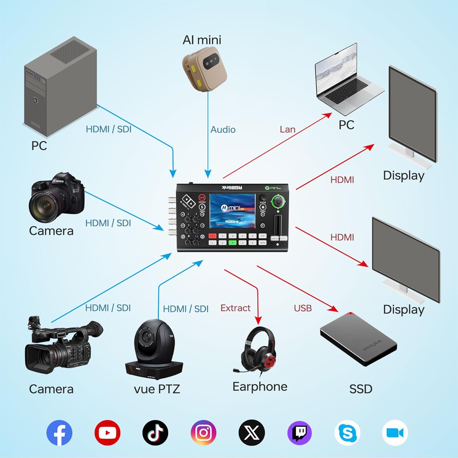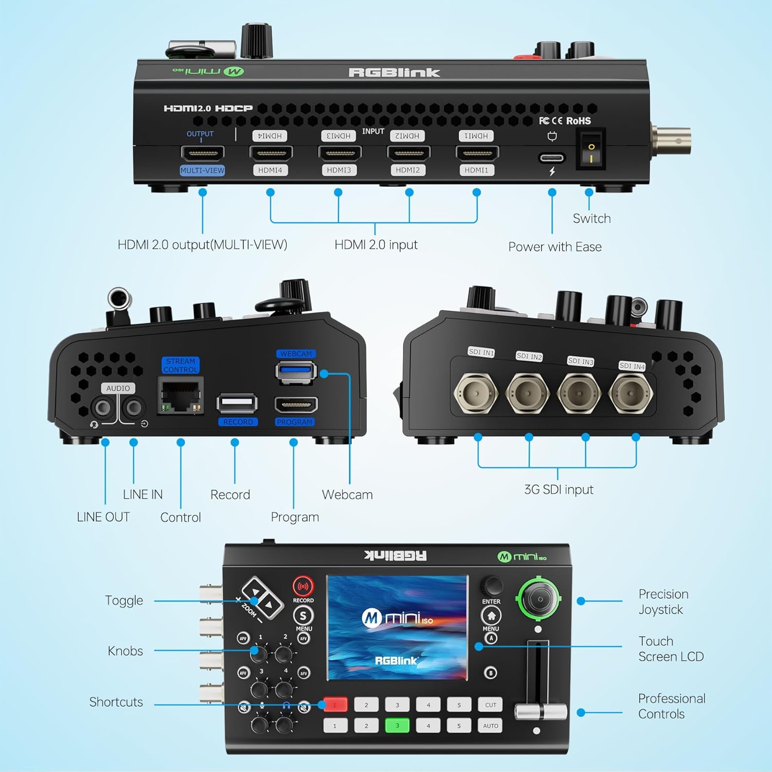 RGBlink mini-ISO Video Mixer Switcher, 10 Channel All-in-One Switcher, Compact SDI and HDMI Live Stream Mixer with PTZ Camera Control, NDI HX Supported,Professional Streaming for Live Streaming