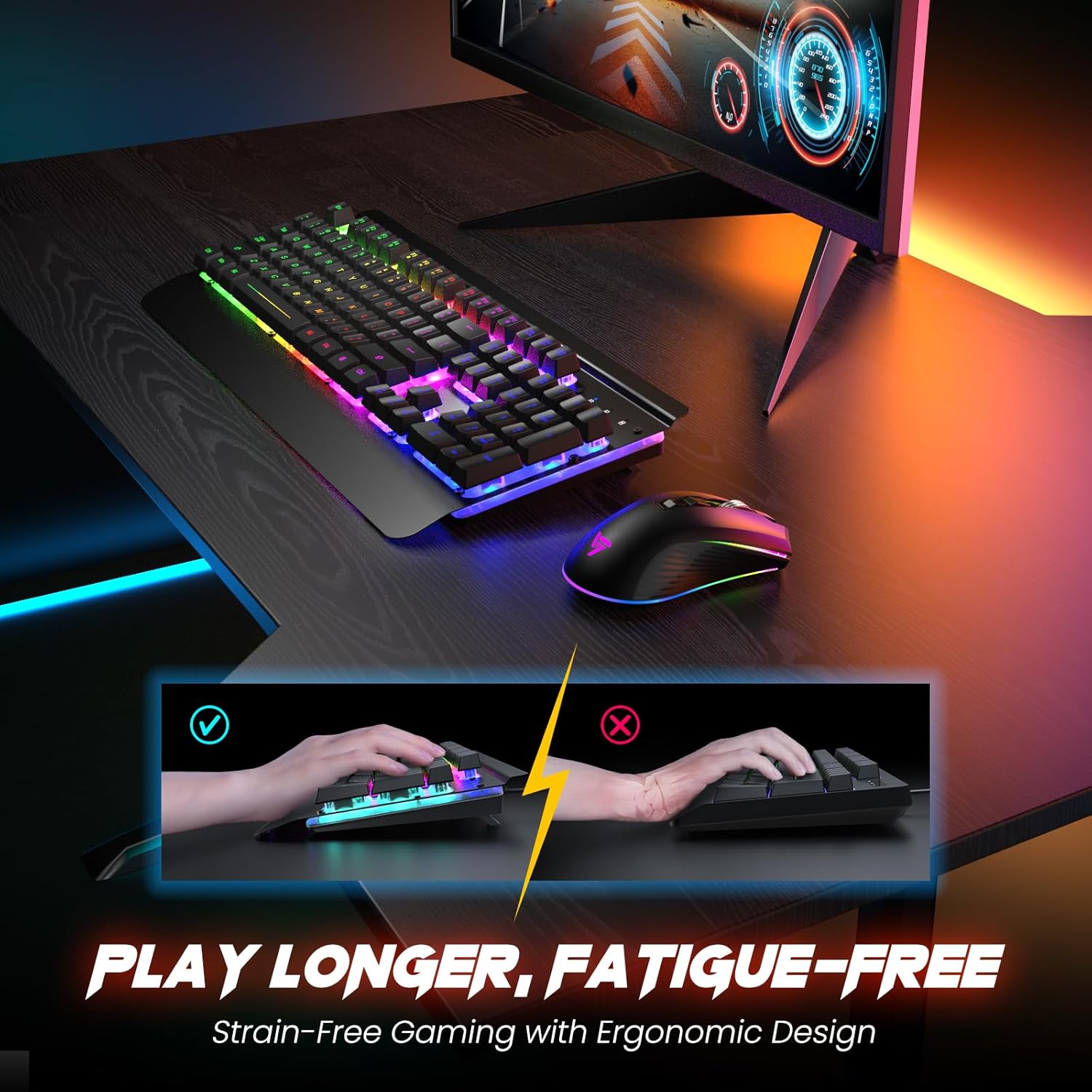 Energy-Efficient and Rechargeable: Our wireless rechargeable keyboard and mouse feature smart auto-sleep functions and a convenient USB-C charging port. Enjoy long-lasting battery life without sacrificing performance. The gaming keyboard and mouse automatically enter sleep mode after 30 minutes and 90 seconds of inactivity, respectively.
