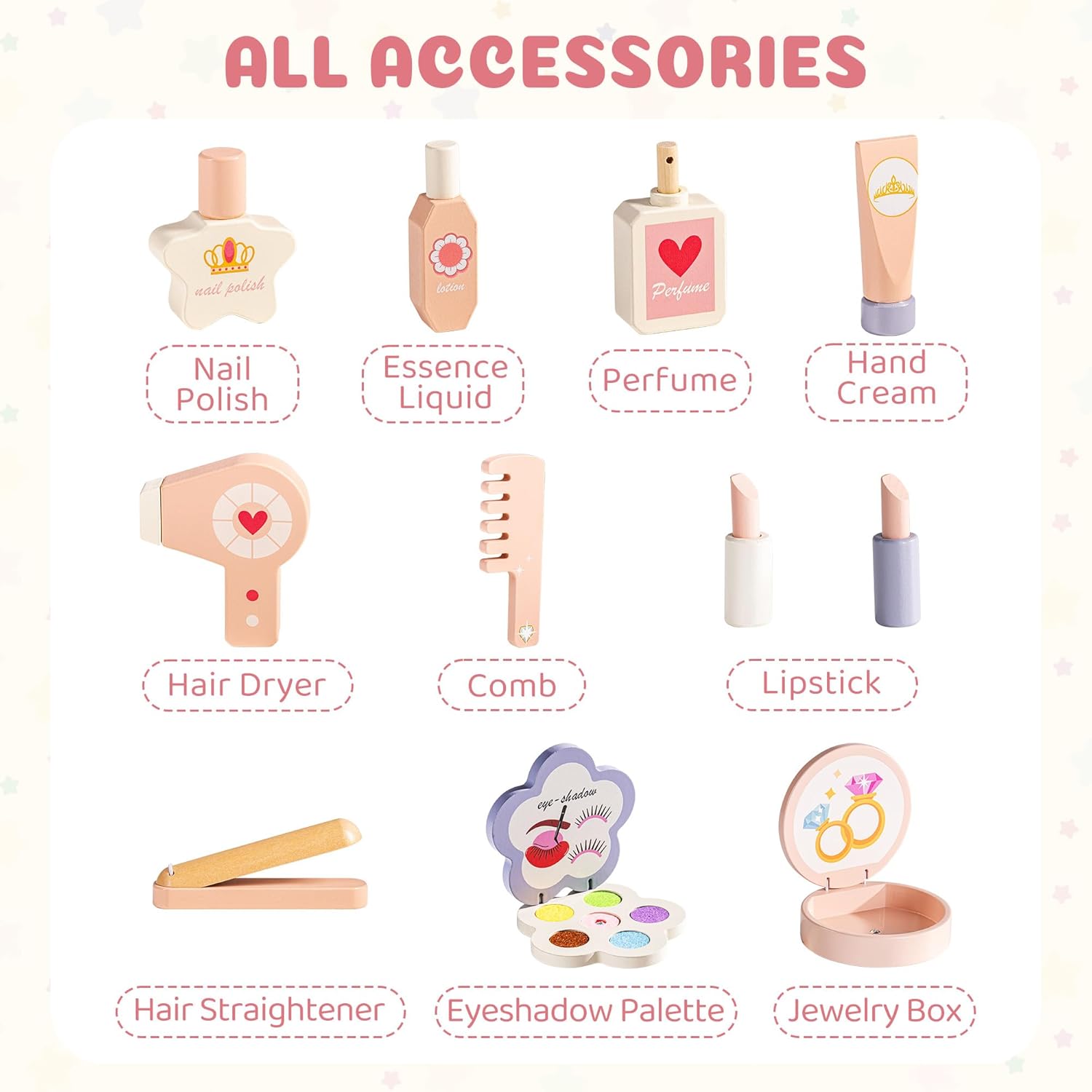 RICH FUNCTIONAL: We have designed a rotatable mirror, storage drawers, shelves and so on for the girls vanity. It comes with 11 kinds of cute accessories such as jewelry boxes, perfumes, hair dryers and lipsticks, with rich functions to meet children’s exploration needs.