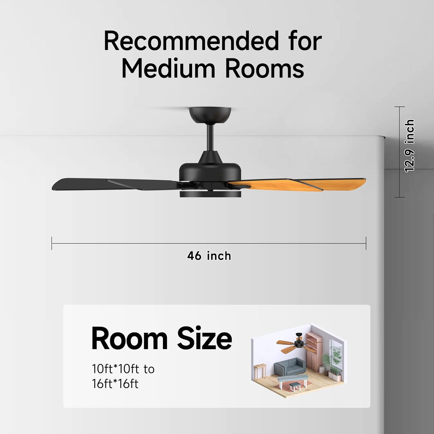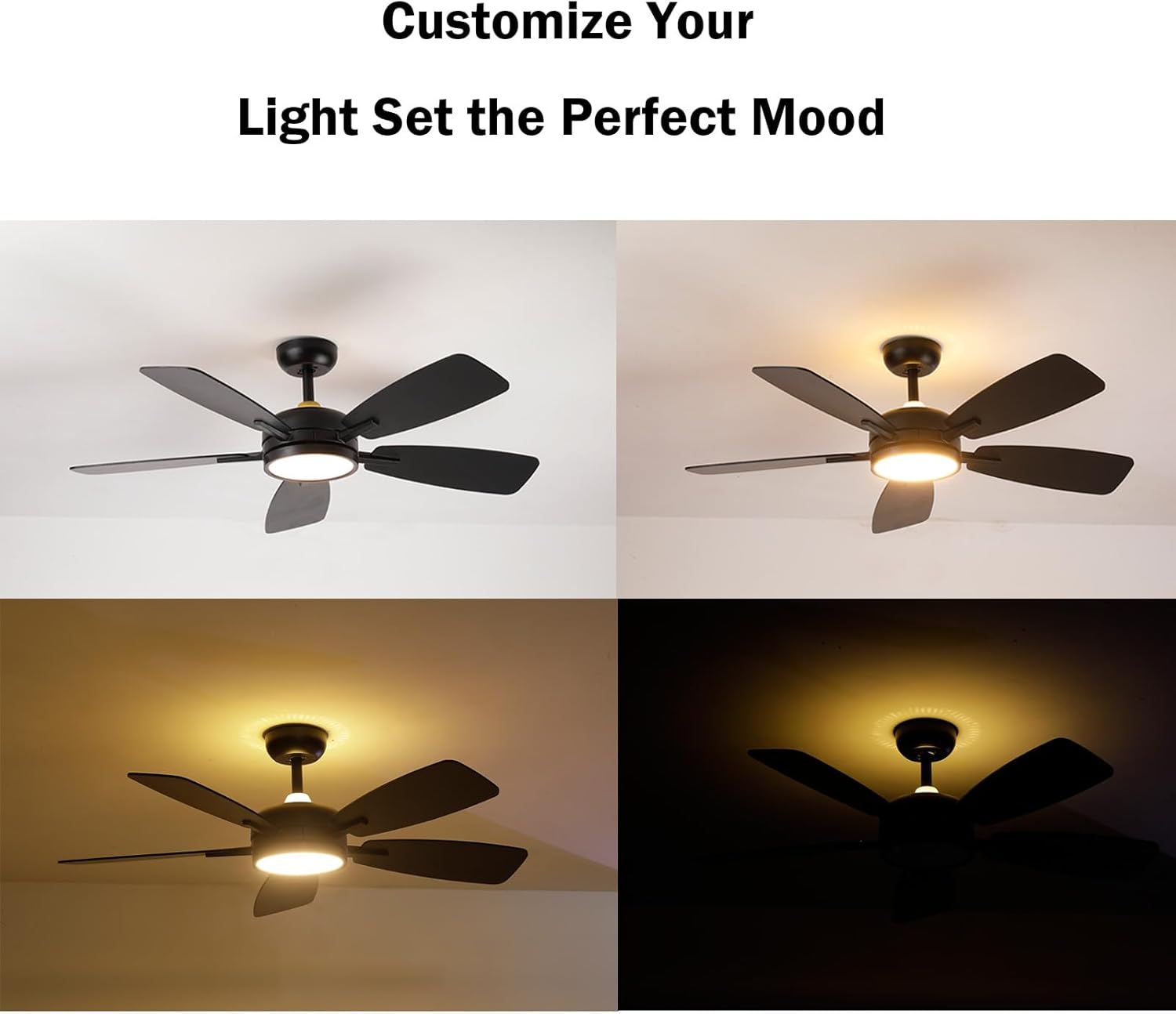 Roomratv Ceiling Fans with Lights,46 Inch,Remote Control,Night Light,Dimmable,Reversible,Noiseless,6 Speeds,Timer,Black Modern Ceiling Fan for Living Room,Bedroom,Kitchens,Kis room,Outdoor Patio