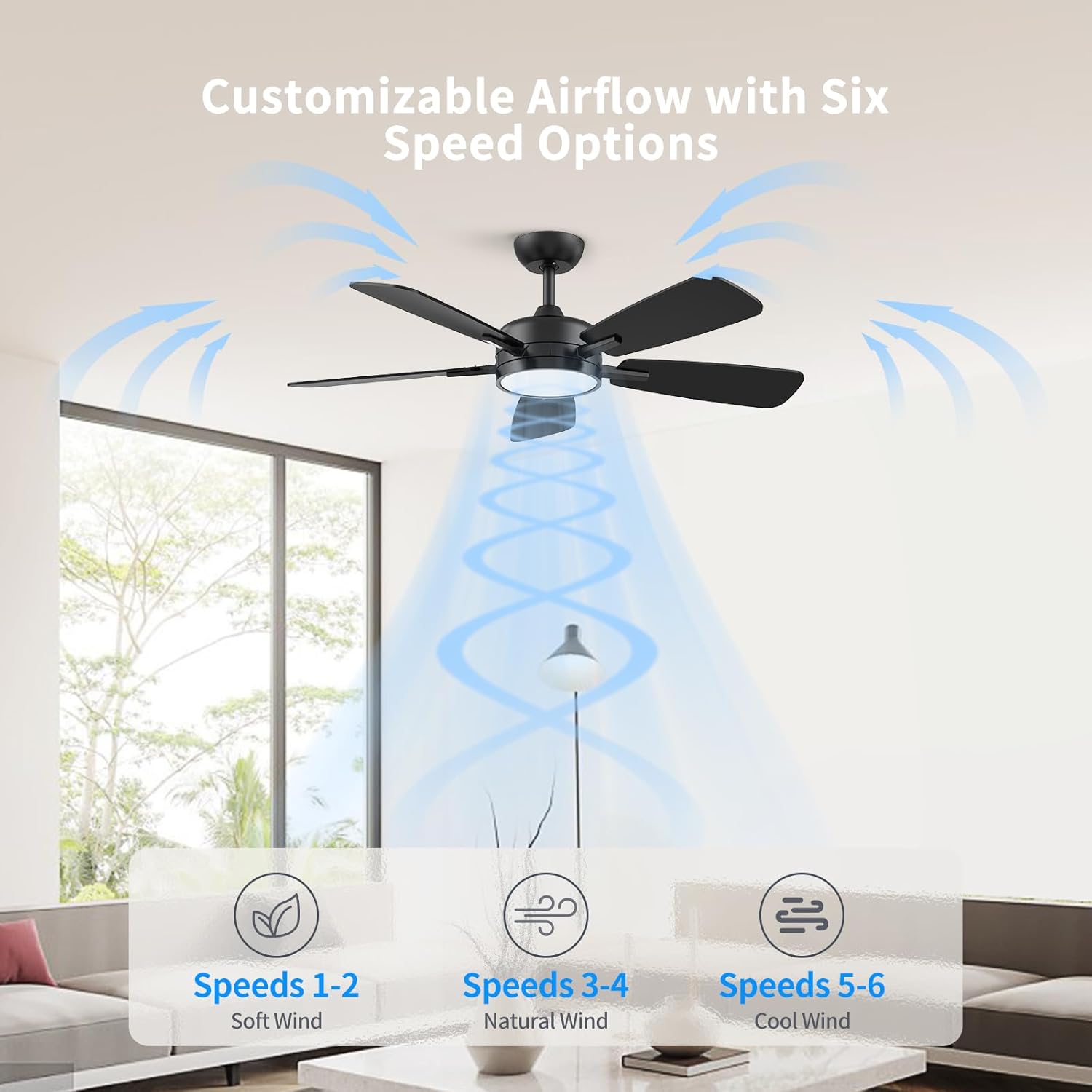 Multifunctional Remote Control:This ceiling fans with lights and remote comes with a convenient remote control, allowing you to easily adjust the fan speed, lighting, and timer settings without needing to get up, offering a seamless and convenient experience. The fan offers six speed settings, so you can choose the perfect airflow for your needs. Additionally, the timer function allows you to set the fan to automatically turn off after 1, 2, or 4 hours