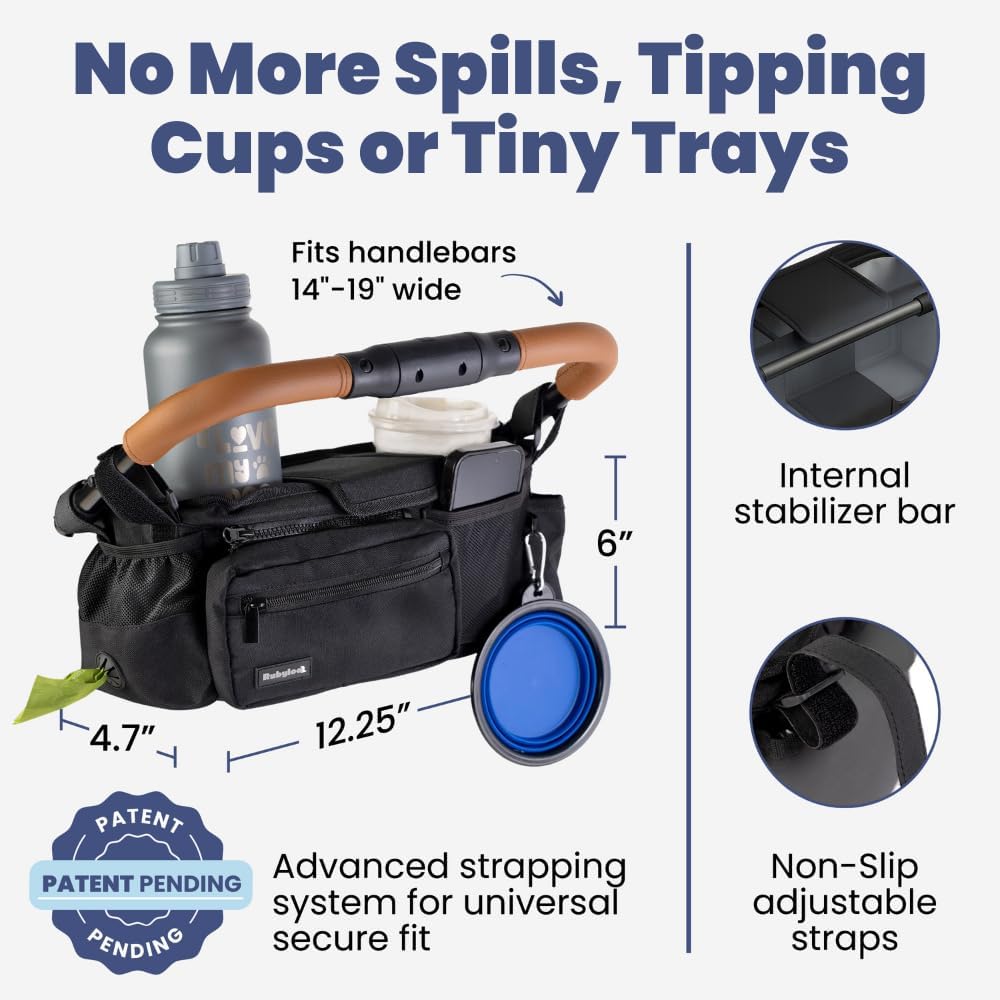 rubyloo Dog Stroller Caddy Organizer with Poop Bag Dispenser, Treat Pocket, Water Bowl – Dog Stroller Accessories with Insulated Cup Holders, Pet Storage & Non-Slip Fit for 14″-19″ Wide Handlebars