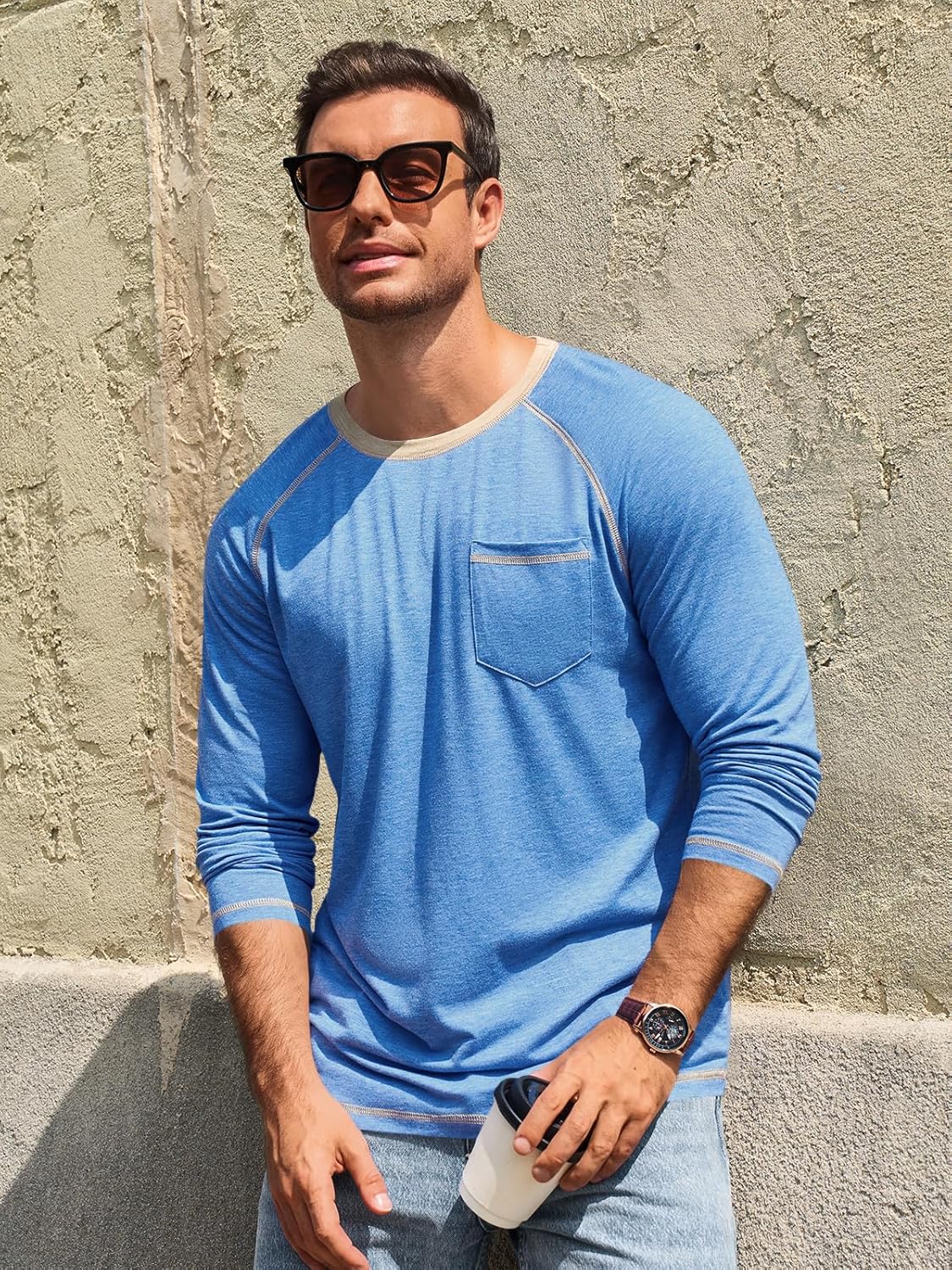 Runcati Mens Long Sleeve T-Shirt Casual Crewneck Shirts Basic Lightweight Vintage Tee Tops with Pocket