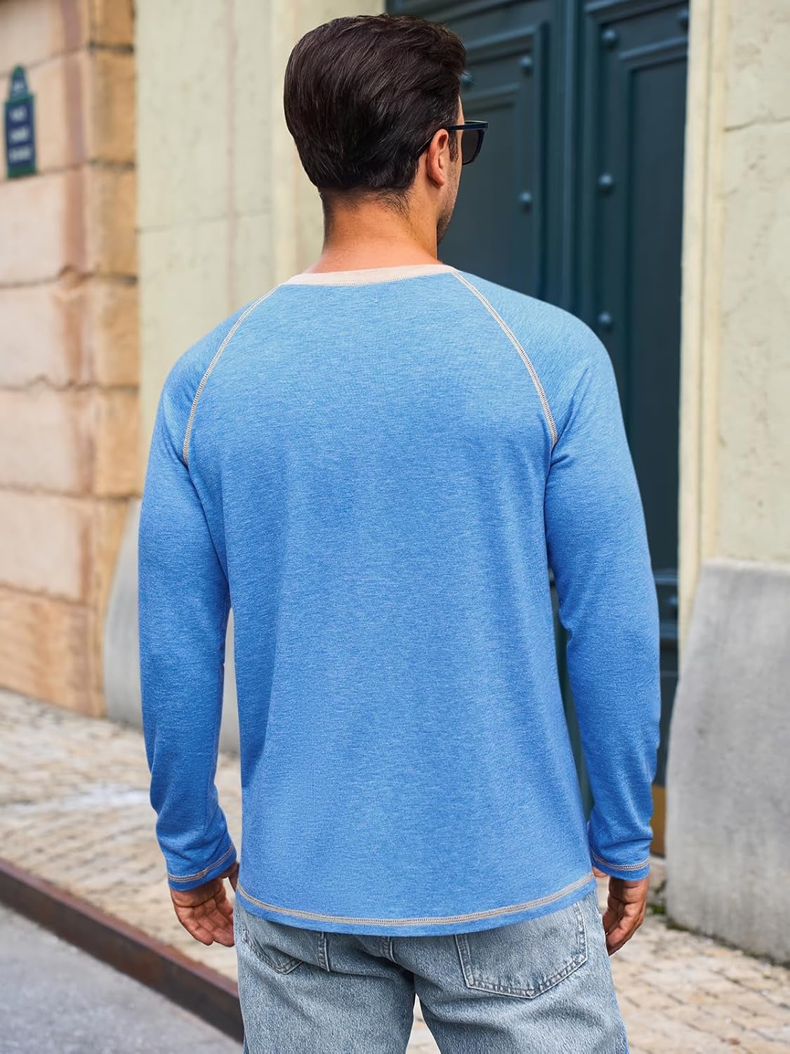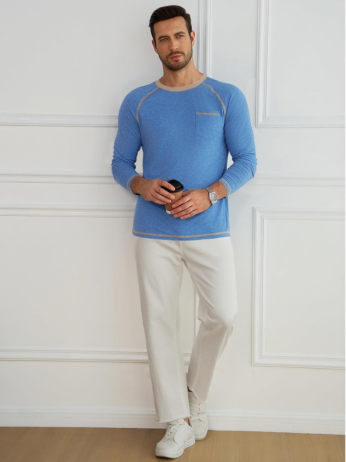 The video showcases the product in use.The video guides you through product setup.The video compares multiple products.The video shows the product being unpacked. Mens Long Sleeve Casual Basic Crewneck T-Shirt Merchant Video
