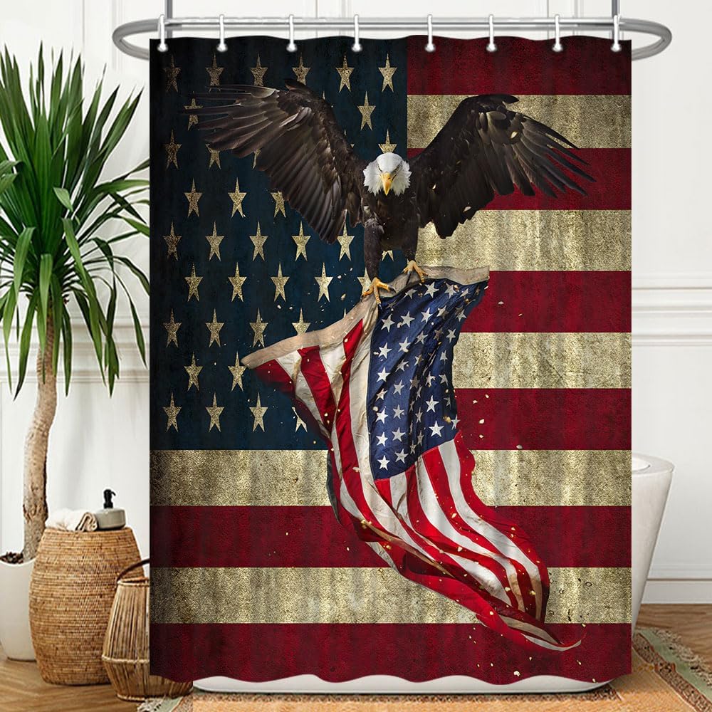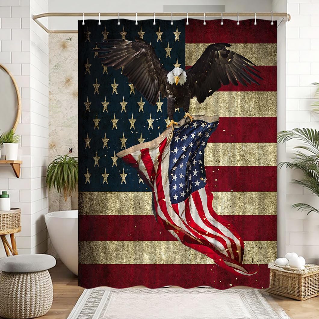 Patriotic Design Shower Curtain: This american flag shower curtain features a bold and vibrant design with a majestic eagle soaring across a backdrop of the American flag, symbolizing freedom and patriotism. The vivid colors and striking imagery make it a perfect addition to any bathroom during Independence Day celebrations.