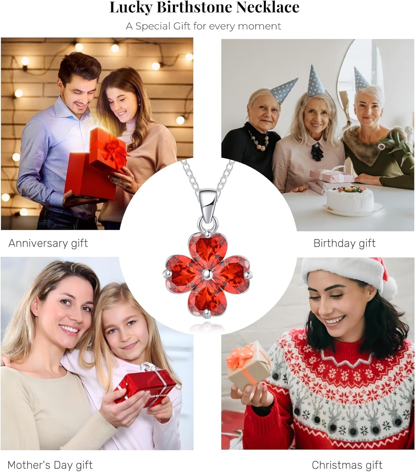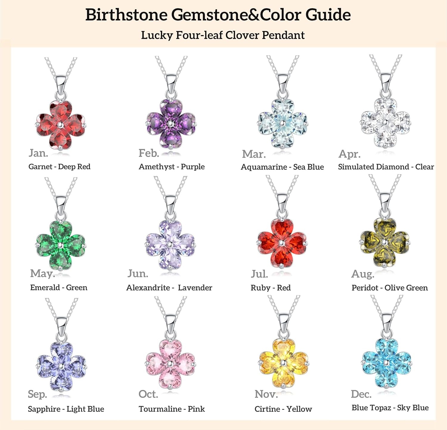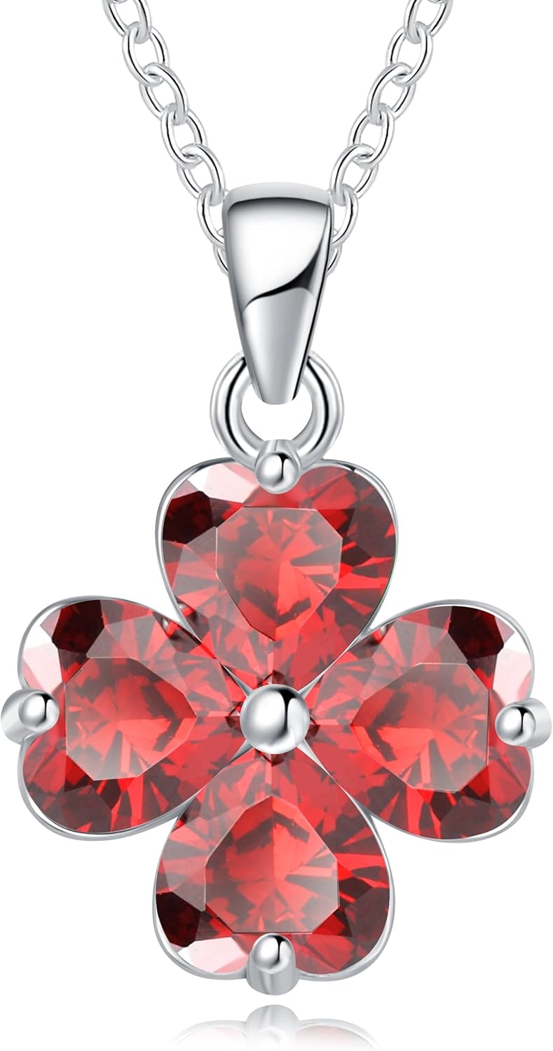 This lucky birthstone necklace is made of the highest grade gemstones and with diamond cutting, it consists of 4 heart shaped gemstones to form a four-leaf clover pendant, the composition of the four gemstones is similar to diamonds, and also the luster and hardness is very close to it, so it sparkles from any angle, the lucky four-leaf clover represents a blessing, wishing good luck to be always with the wearer, nice gift for mom, daughter, wife, girlfriend, grandma, friends or yourself.