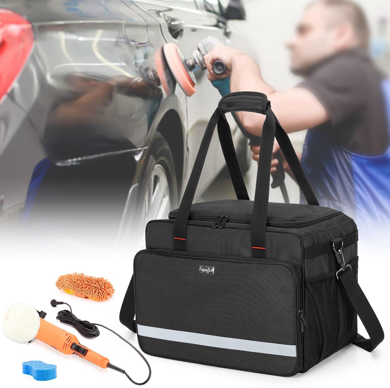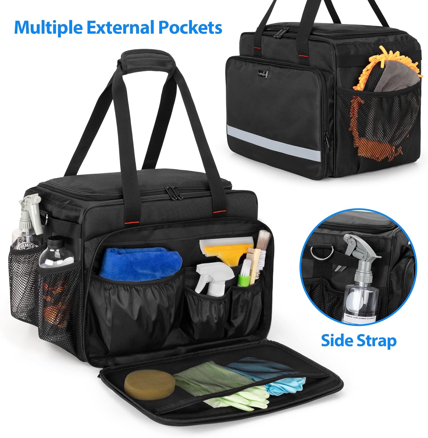 High Capacity: Detail bag size: 16.5 x 10.5 x 12.7 in, deep enough to hold 16 oz / 500 ml cleaning bottles, the large capacity and strong load-bearing to store polisher, buffers, tire shine bottles, cleaning sprays, microfiber towels and other vehicle care supplies