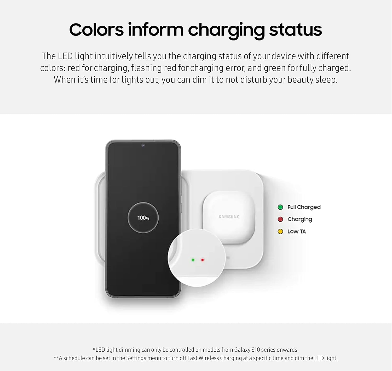 Get the charge you need quickly, thanks to up to 15W of Fast Wireless Charging support. This charger boost is compatible with USB PD and Super Fast Charging travel adapters for an easy pick-me-up.* Simultaneously power up your favorite pair of devices to enjoy together — whether that’s your phone and Galaxy Watch or your Galaxy Watch and earbuds.** The Super Fast Wireless Charger Pad has a built-in cooling system with a fan and charges your phone fast.*** Simply place the Wireless Charger where you want it. With a slim, smooth and compact design, it fits even in your smaller spaces, so it’s easy to access when your phone or earbuds need a little extra juice.**** The LED light intuitively tells you the charging status of your device with different colors: red for charging, flashing red for charging error, and green for fully charged. When it’s time for lights out, you can dim it to not disturb your beauty sleep.***** *Super Fast Wireless Charging speed requires included 25W power adapter and only available with Galaxy Note10, Note10+, S20, S20+, S20 Ultra, Note20, Note20 Ultra, S21, S21+, S21 Ultra, Z Fold, Z Fold2, Z Fold3, Z-Flip, Z-Flip3, S22, S22+, S22 Ultra. Compatible with all Galaxy devices that support wireless charging. Charging speeds may vary by device. Actual charging speed may vary depending on usage, charging conditions and other factors. 25W power adapter and above required for Super Fast Wireless Charging. 15W power adapter and above required for normal charging. Compatible with Apple smartphone models iPhone X and later, that support up to 7.5W fast charging. Galaxy Watch charging feature supports up to 4.5W. **The secondary part of this charger cannot charge a mobile phone and is only compatible with all Galaxy Buds and Galaxy Watch Active 1 and later watch models. ***The cooling fan exists on the primary side. Cooling fan can be used to cool down both primary & secondary side. User can turn off cooling fan by turning off “fast wireless charging” option on Galaxy mobile when charging Galaxy mobile. ****Wireless charger requires power connection. Recommend using in-box charging cable and/or travel adapter for use. Third party items may cause damage to the charger or a decrease in charging speed. *****LED light dimming can only be controlled on models from Galaxy S10 series onwards. A schedule can be set in the Settings menu to turn off Fast Wireless Charging at a specific time and dim the LED light.