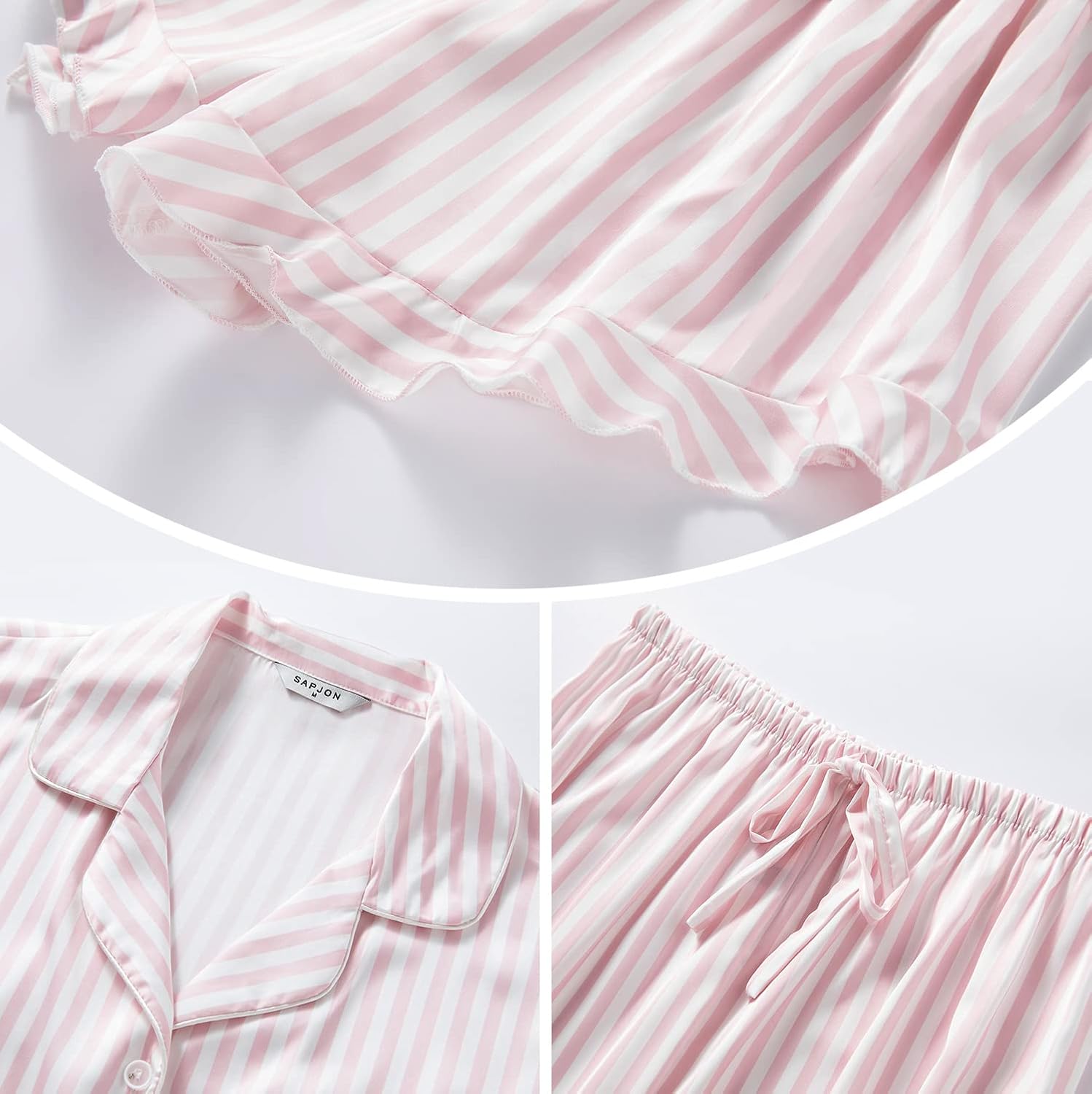 2 Pcs Pajama Set – Silk pajamas for women 2 piece, include button-down short sleeve and ruffled shorts.Color & Size – Multi-colors and size for choice. Solid color series, stripe series, leaf series and so on.Pajama Short Sleeve – Classic Notch Collar, Full Button Design is easy to put on and take off.Pajama shorts – Ruffled design, Bow tie decor, high & elastic waist.
