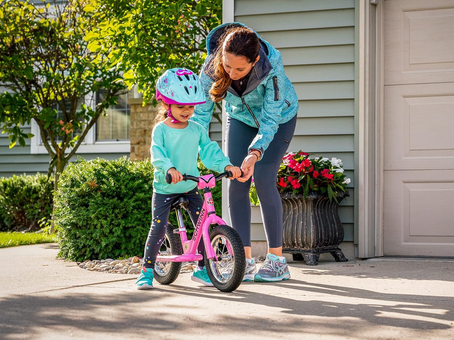 Designed with 12-inch wheels, this bike fits riders ages 1 to 4 years old, or 28 – 38-inch tall