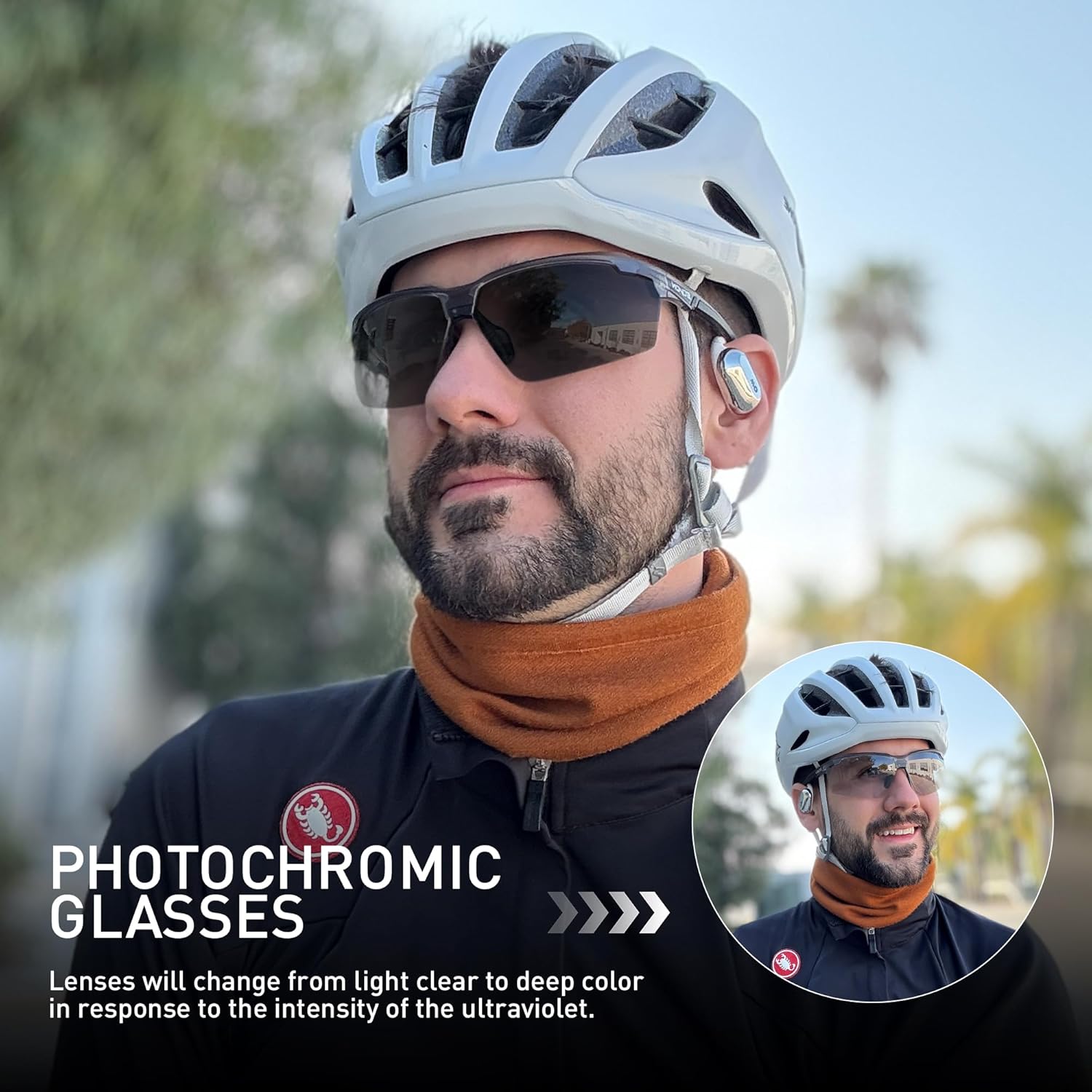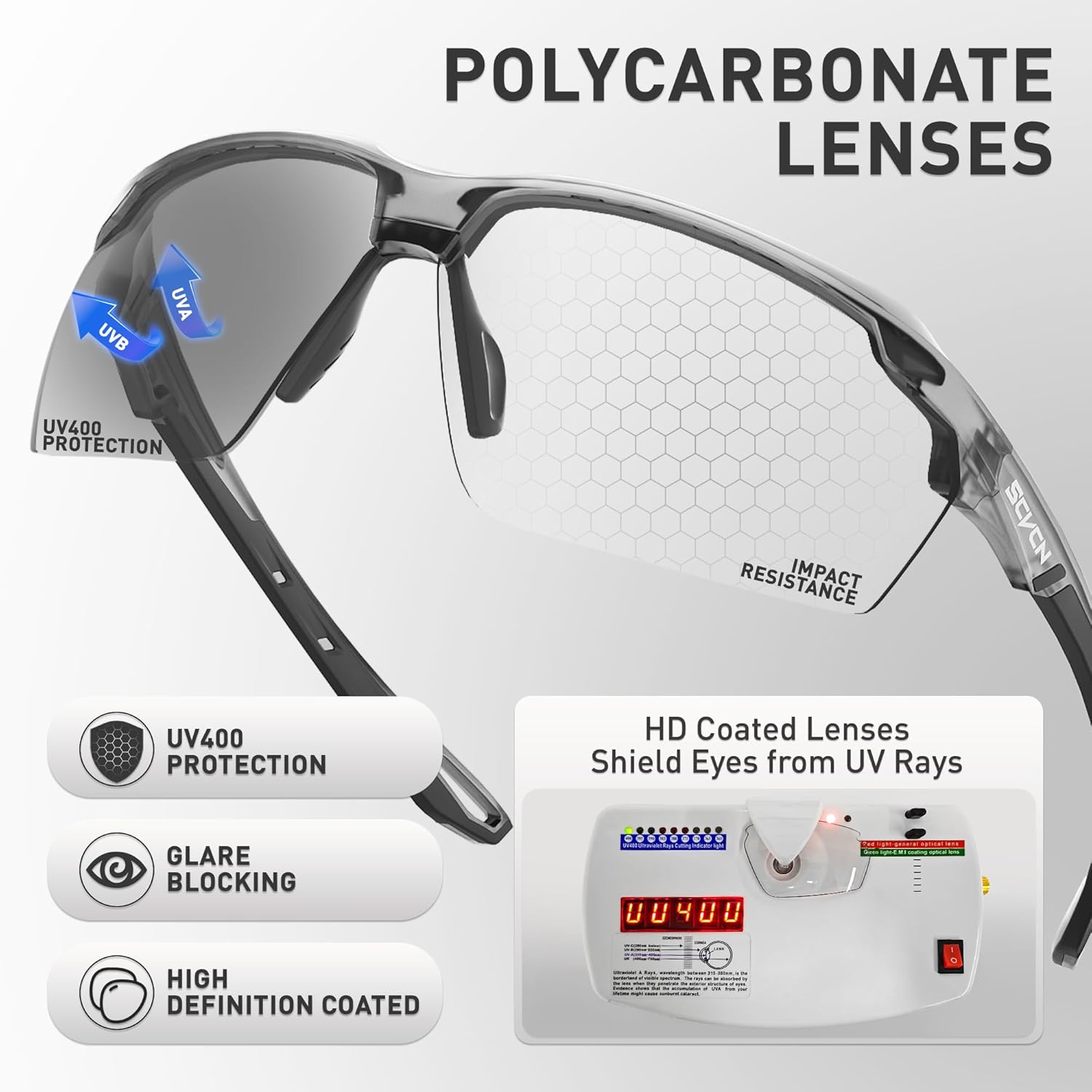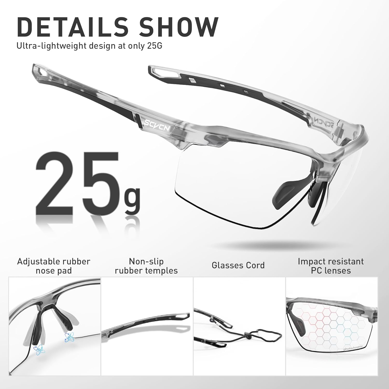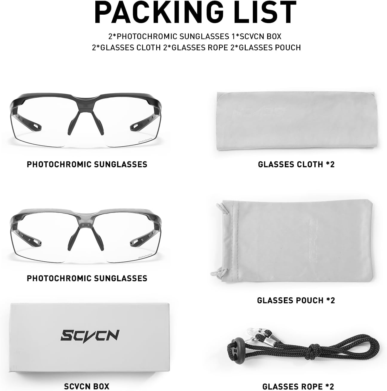 SCVCN is an original cycling equipment brand, operated by a team full of enthusiasm. Our goal is to ensure the highest quality of products and inspire cyclists with extraordinary craftsmanship. As a professional cycling brand, we firmly believe that only high – quality materials can create outstanding products and experiences. SCVCN glasses perfectly integrate technology and stylish design. The lenses employ photochromic technology, capable of sensing the intensity of ultraviolet rays and automatically adjusting the lens color to adapt to light changes. Meanwhile, with its excellent UV400 protection performance, it can effectively block the harm of ultraviolet rays, allowing you to enjoy outdoor activities without worry. In various application scenarios, it performs outstandingly and can be regarded as a capable partner for sports enthusiasts. Choosing SCVCN photochromic glasses is equivalent to embracing an intelligent, healthy, and stylish lifestyle concept. They are not just glasses but a precise visual guarantee for you to shuttle through different scenarios, meeting your eye needs anytime and anywhere. Get them now and embark on a brand – new journey towards a clear vision!