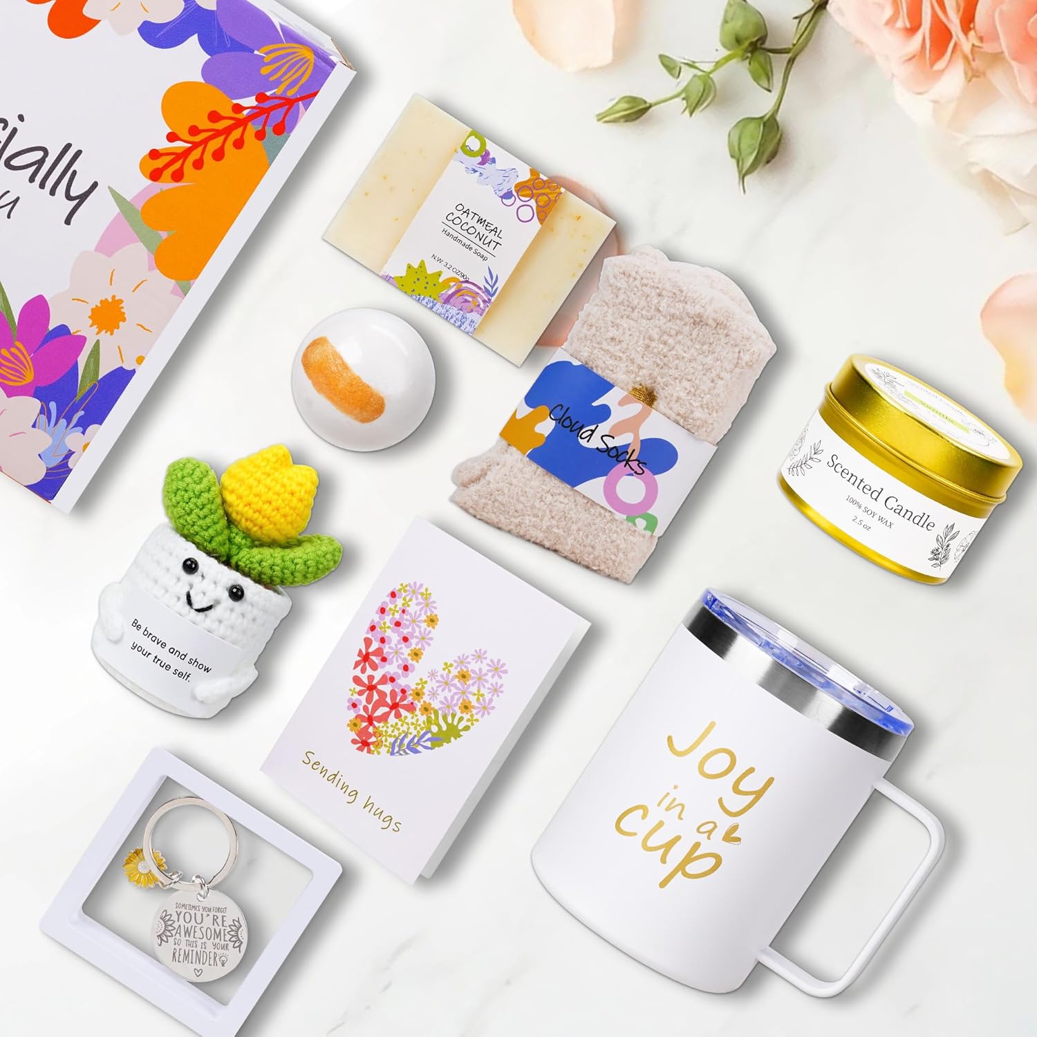 9-Piece Care Package for Women – Full of Warmth This complete care basket includes 9 luxury items all chosen to show love, ease stress, and express gratitude: hand-knit cactus decor, insulated tumbler, vanilla coconut aromatherapy candle, lavender bath bomb, handmade oatmeal coconut soap, fuzzy socks, encouragement keychain, greeting card, and elegant packaging. Every piece blends practicality and thoughtfulness—whether for a birthday, get-well wish, or “just because” moment, it gives her the pampering and care she deserves
